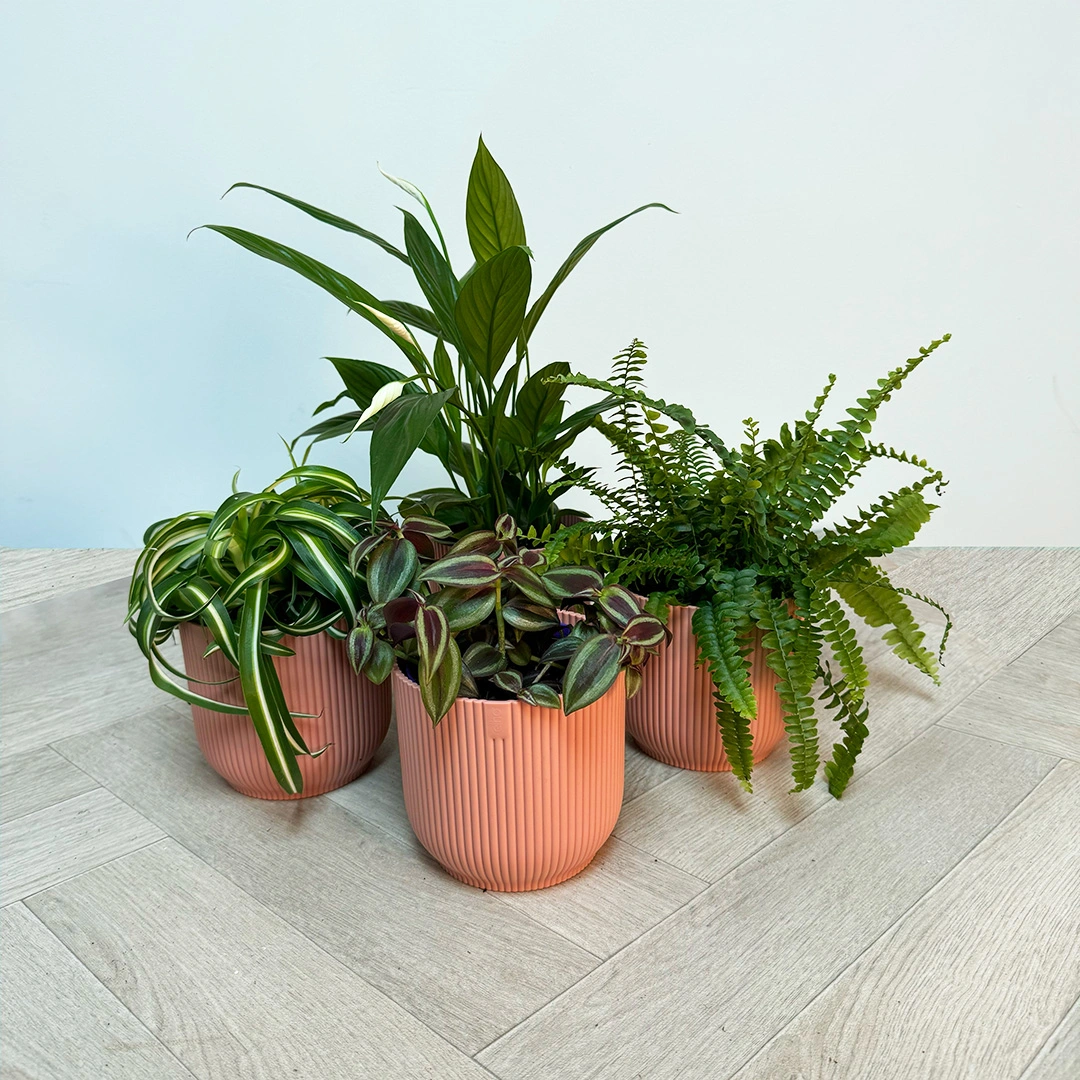 - Latin nameBoston Fern, Curly Spider Plant, Peace Lily, Purple Heart + Pink Elho Pots