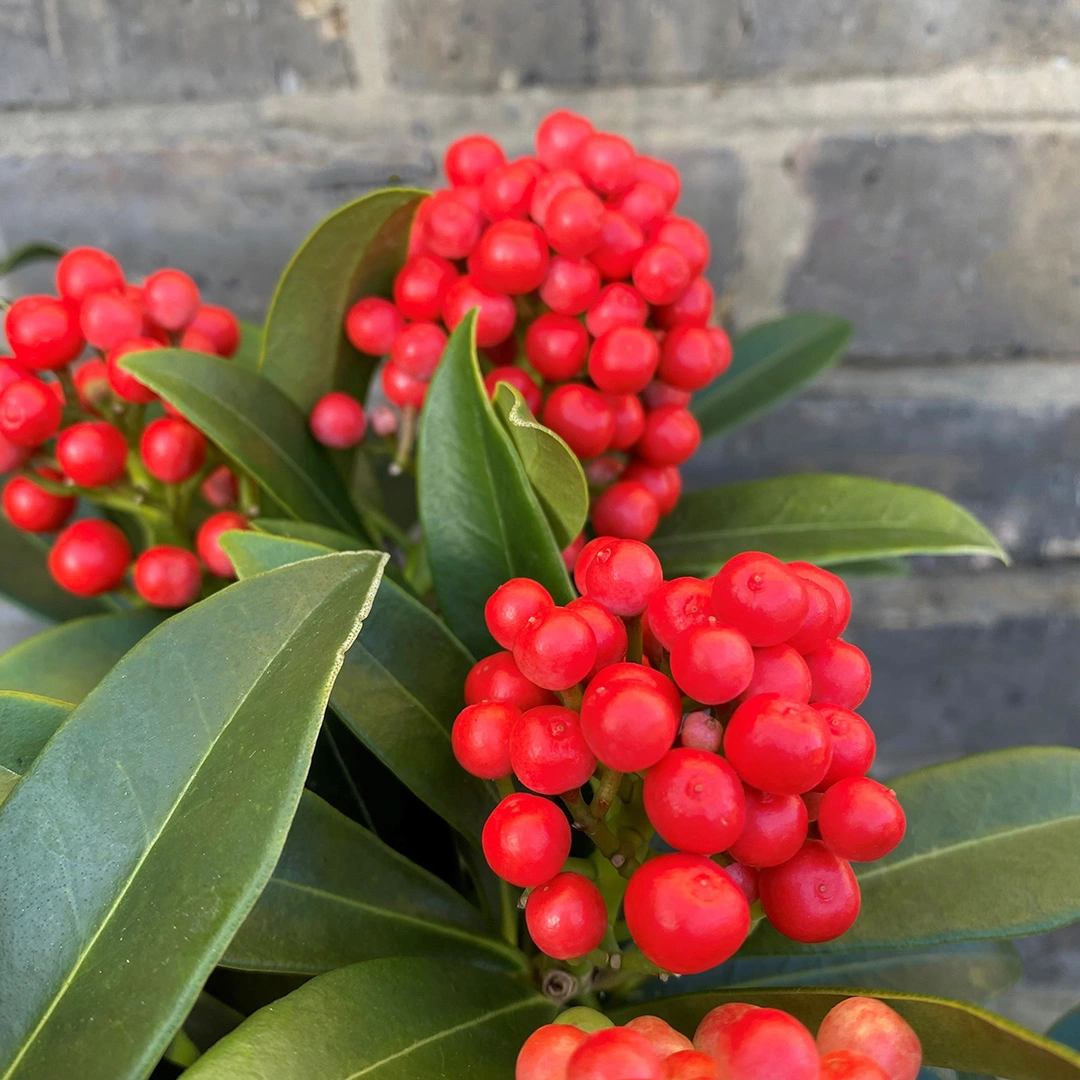 - Latin nameA decorative terracotta planter and evergreen Skimmia with large glossy red berries.