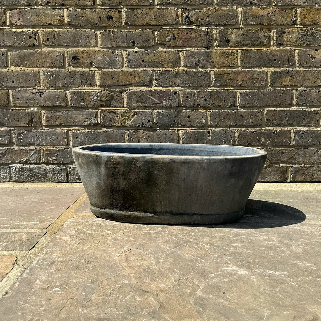 This exquisite Handmade Oval Trough Planter Window Box exudes a timeless charm with its dark patina finish and authentic aged appeal. Designed to elevate any garden or window setting, it provides an ideal home for small perennials and bedding plants. Constructed with frost and UV-resistant materials, this planter is built to endure diverse weather conditions while maintaining its sophisticated appearance. A thoughtfully incorporated drainage hole ensures proper water flow for direct planting, fostering healthy root development. Available in two versatile sizes, this oval trough planter allows for creative arrangements, whether it's a lush floral display or a serene succulent composition. Its vintage-inspired aesthetic blends seamlessly with various outdoor styles, bringing a touch of rustic elegance to your patio, windowsill, or garden nook. With its durable construction and distinctive patina finish, this planter is a harmonious fusion of practicality and timeless design, offering both function and beauty for your gardening needs. Whether you're a seasoned gardener or a novice plant enthusiast, this planter provides the perfect canvas to nurture and showcase your botanical creativity.