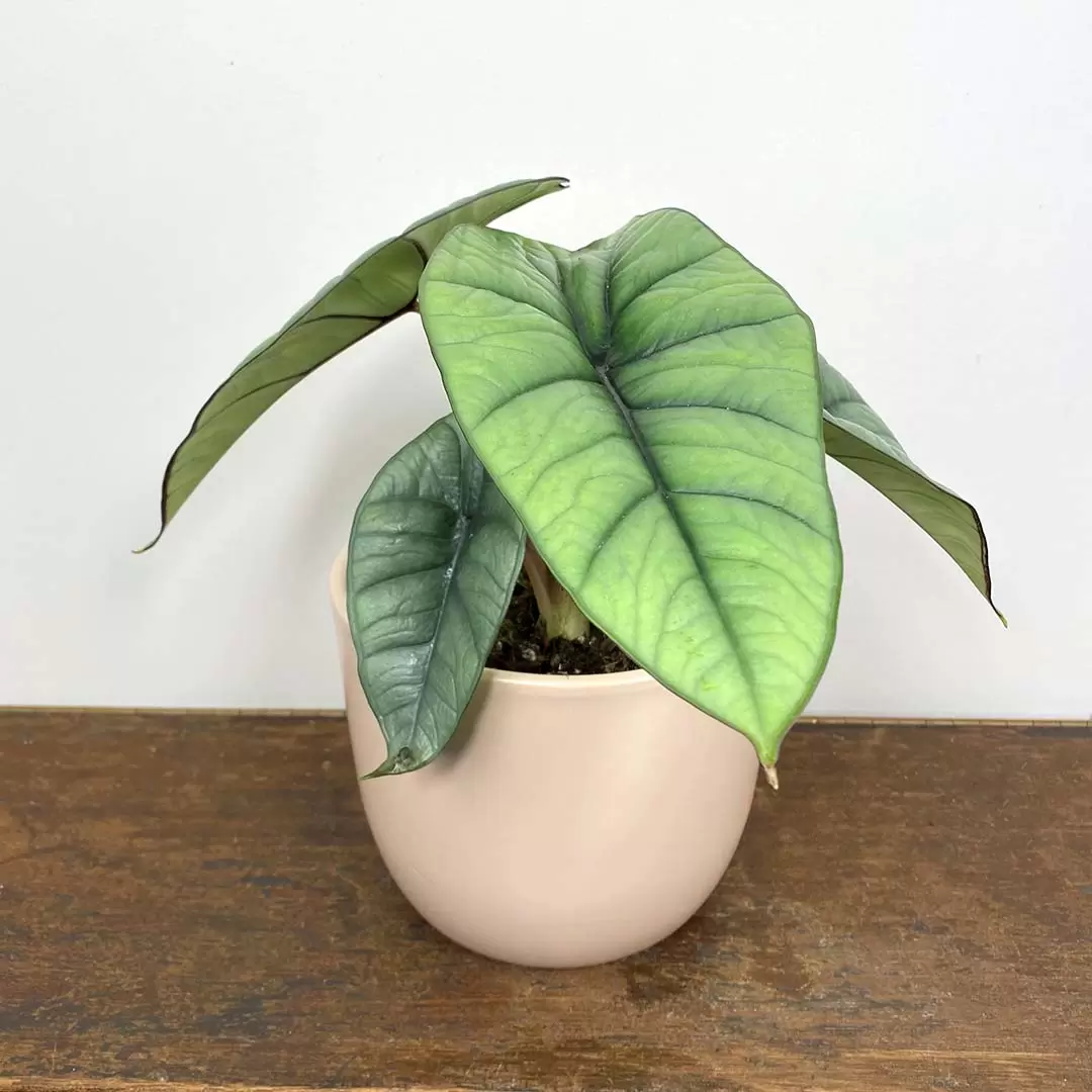 Alocasia looks fabulous in a ceramic or terracotta pot on top of a dresser or as a living room feature plant. Its silvery dark green leaves, deep veins, and pale silvery-white under leaves with burgundy veins.