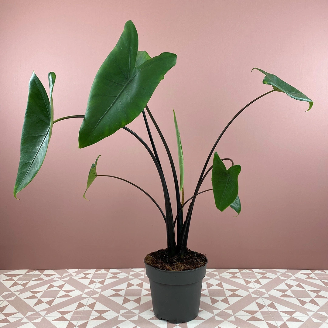 Alocasia 'Black Zebrina' is a beautiful variety with its stylish black stems, rich green foliage and elegant ovrall appearance. Native to South East Asia they like warm humid environments for lush leafy growth.