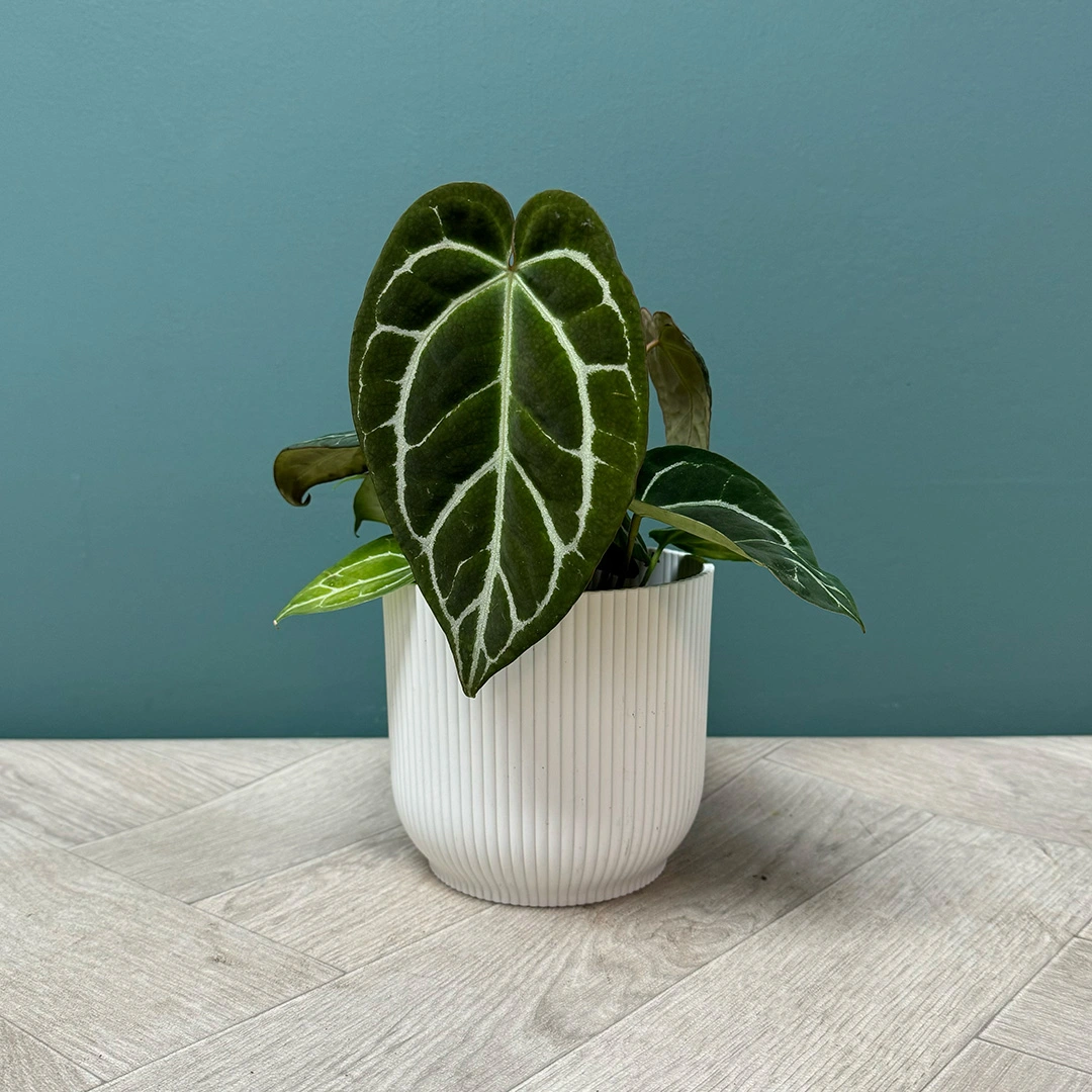 Step into a world where foliage takes centre stage with the Anthurium Crystallinum, commonly known as the Crystal Anthurium. Known for its enchanting, heart-shaped leaves with a rich, velvety texture and prominent white veins, this aroid is a spectacular addition to any interior, providing both aesthetic appeal and air-purifying benefits. Each leaf, a blend of dark green and lustrous silver, can spread to an impressive size, offering a maximum height and spread of approximately 90cm and 60cm respectively. When housed in a bright, well-lit area shielded from direct sunlight, and partnered with other high-humidity lovers such as the Peace Lily or Calathea, the Crystal Anthurium creates a lush, tropical haven in your living space. Suited for indoor environments, this plant adorns desks, shelves, and tables with its unique, luxurious appeal.