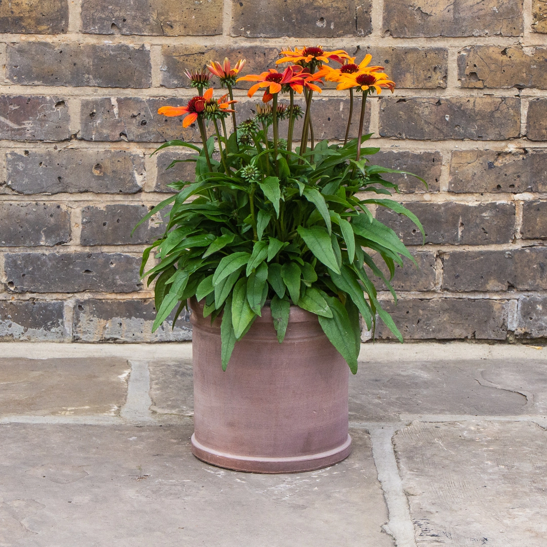 Crafted meticulously from premium terracotta, its surface boasts a naturally aged patina that reminisces tales of bygone eras. The distinctive cylinder design is accentuated by a pronounced rim, giving your plants a pedestal to stand on and shine.