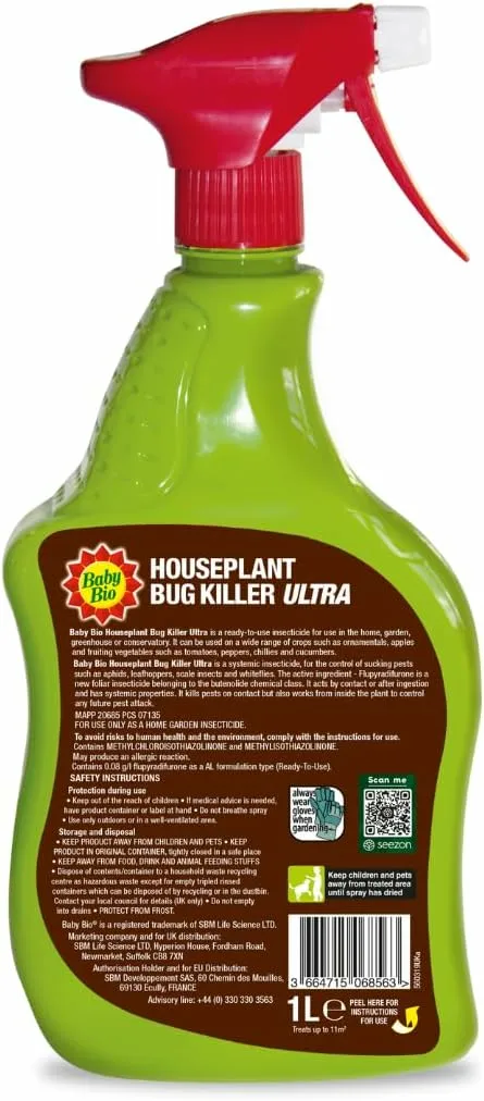 Baby Bio Houseplant Bug Killer offers a swift and effective solution to insect infestations, safeguarding your houseplants with up to two weeks of protection. Whether indoors or in the garden, this product is designed to combat common pests such as whitefly, greenfly, and blackfly, ensuring your plants can thrive in a pest-free environment. Its ready-to-use spray bottle features a convenient twist and lock mechanism for quick application, making it ideal for use at the first sign of infestation. For optimal plant health, combine it with Baby Bio Houseplant Food and Leaf Shine, providing a comprehensive care routine for your greenery. However, it's important to use this biocide safely, adhering to the instructions to mitigate risks to human health and the environment, especially considering its toxicity to aquatic life.