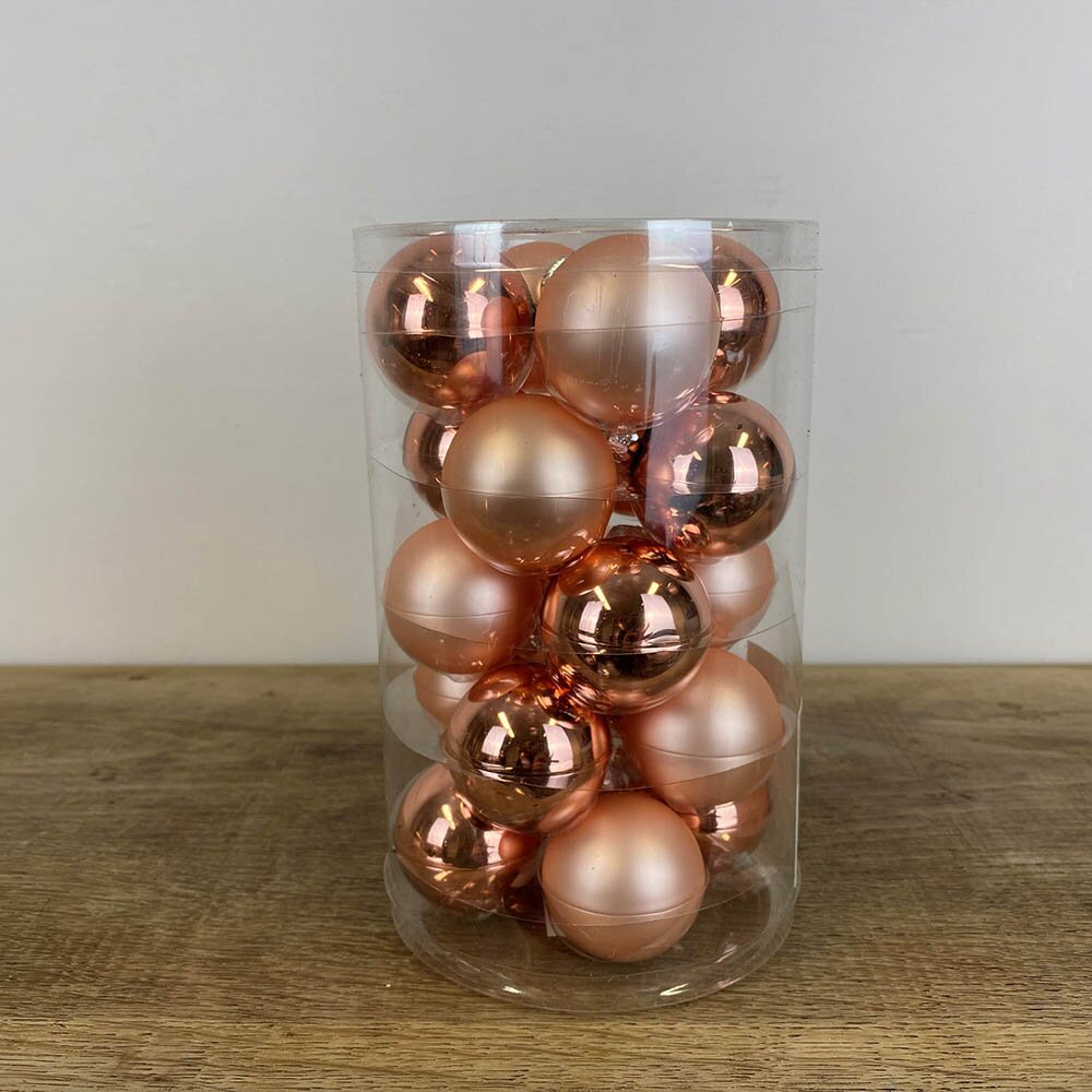 Glossy traditional baubles in bright pink with two finishes. 10 have a shiny finish and 10 have a matt finish. Glass decorations with a silver hanger.
