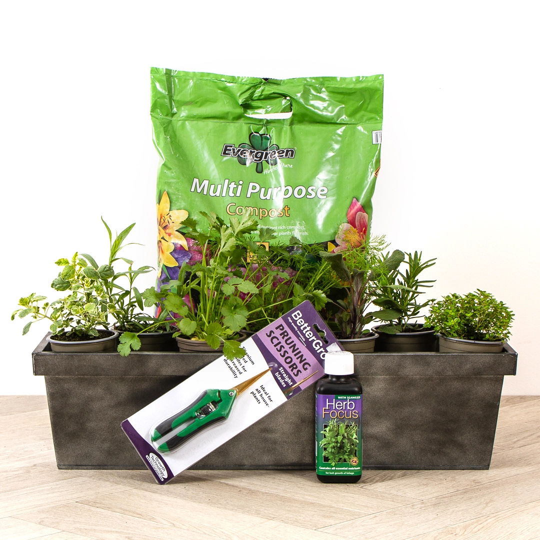 - Complete Growing Essentials: Includes 10L of Evergreen Multi-purpose compost for healthy plant growth, pruning scissors, and Herb Focus liquid fertilizer.