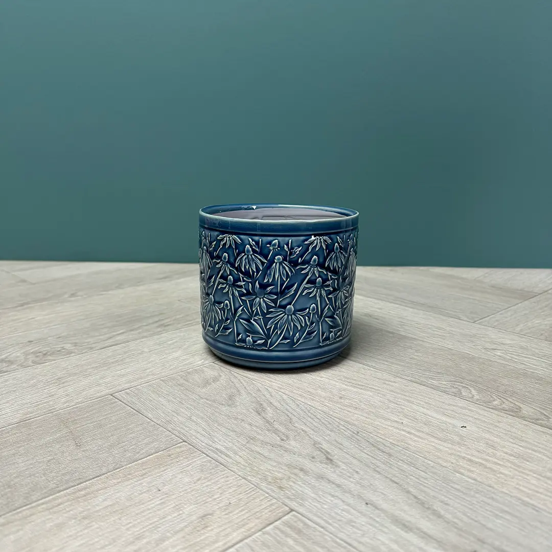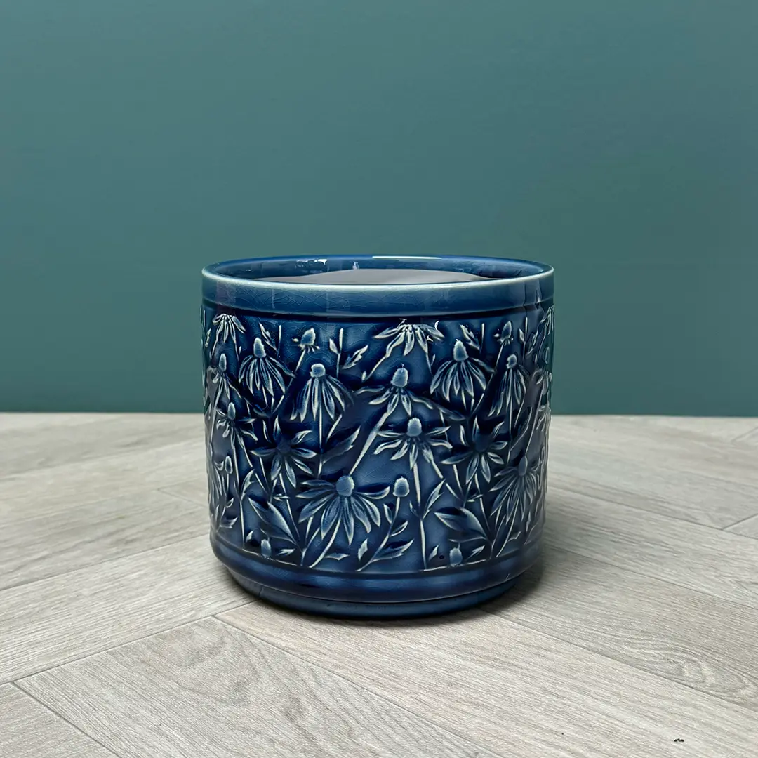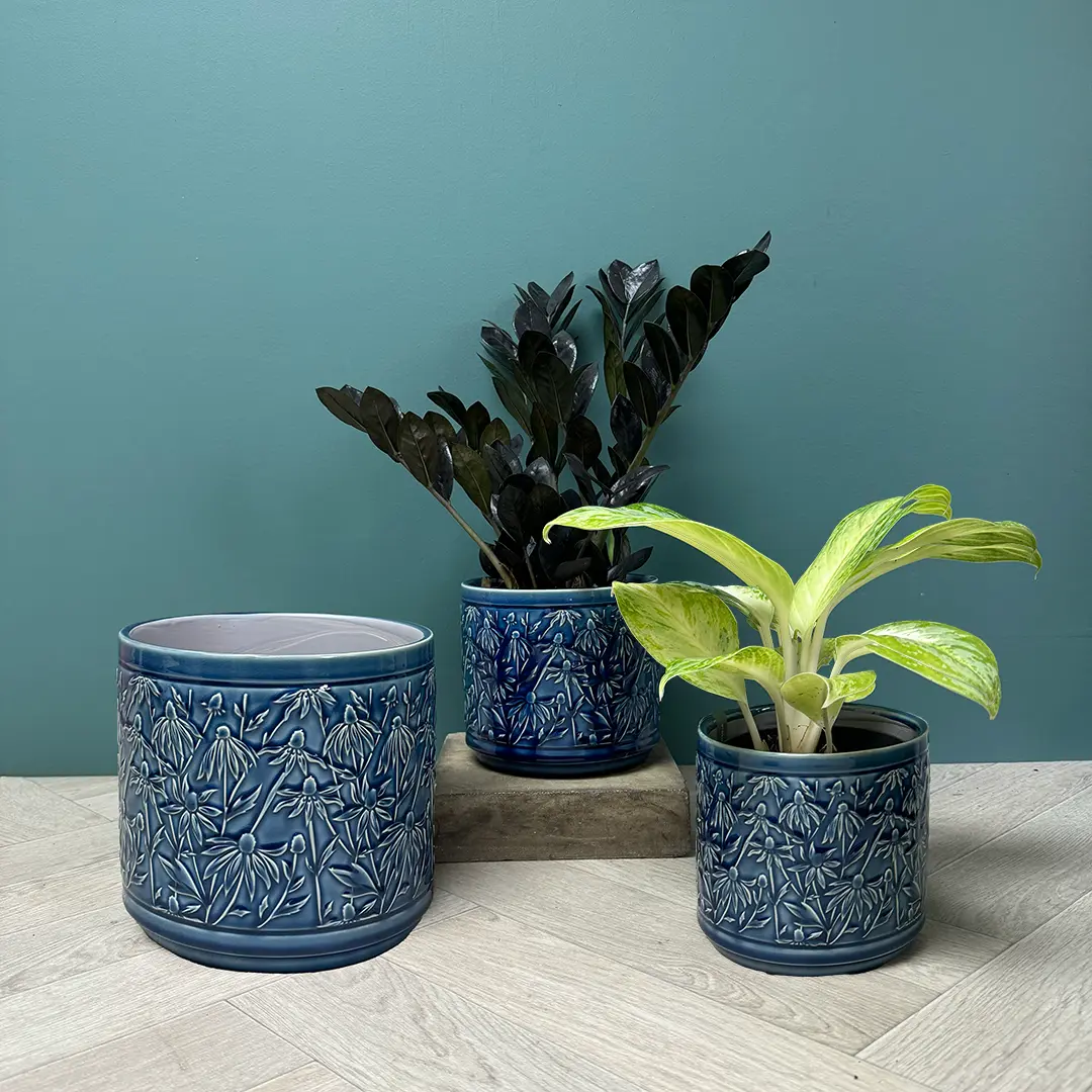 Elevate your home decor with the Blue Rudbeckia Pot, a beautifully crafted ceramic plant pot that combines practicality with artistic flair. This pot is available in two striking colours: a bold berry-red and a calm blue, each glazed with an ornate yet contemporary plant pattern in white embossed relief. The unique hand-painting process introduces subtle tones and colour drops, ensuring that no two pots are exactly alike and adding to their handmade charm.