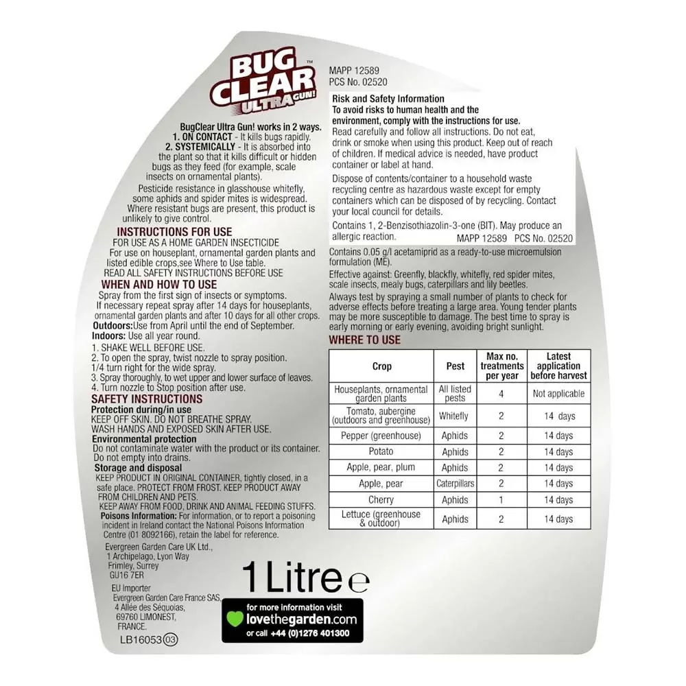 BugClear Ultra Gun! is a contact and systemic action insecticide offering a broad spectrum of pest control that protects for up to 3 weeks.