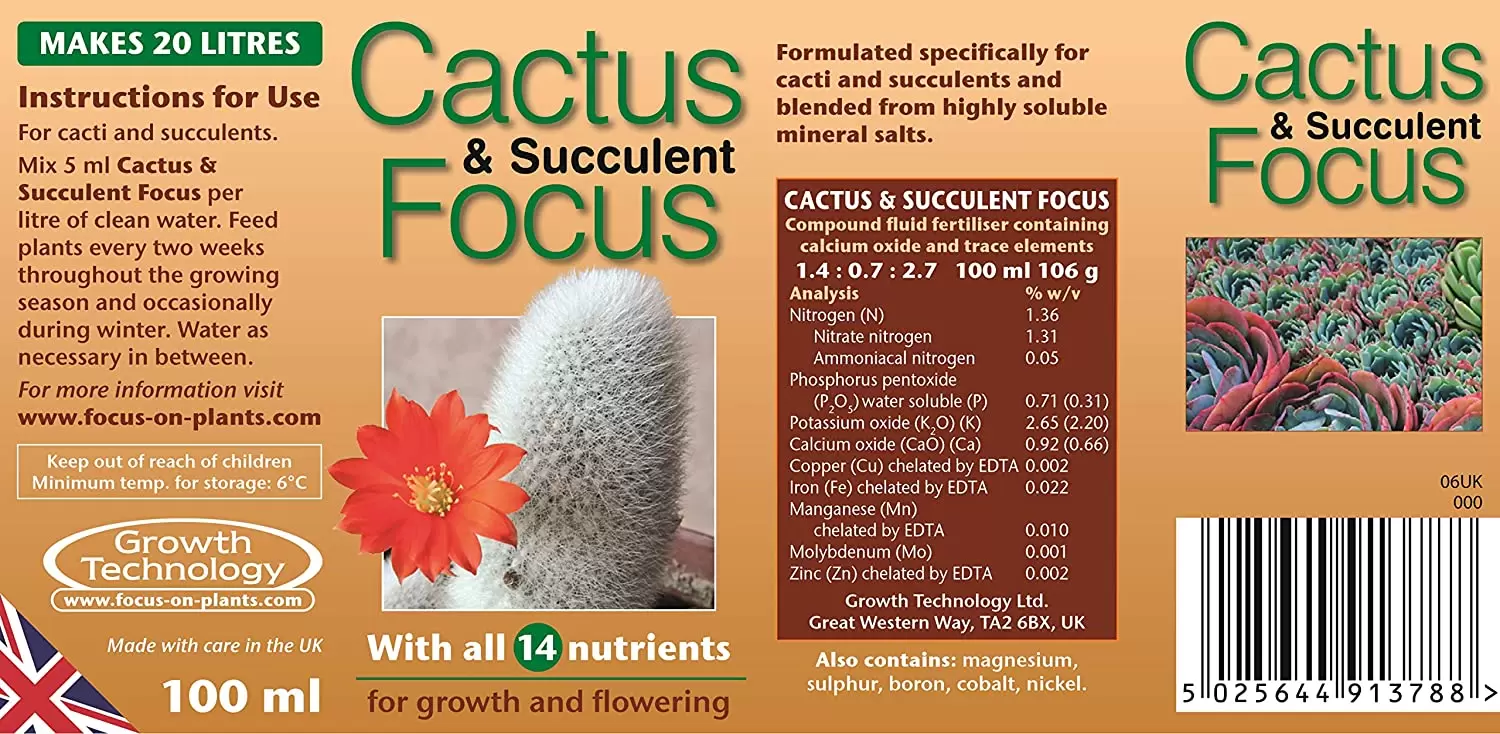 Growth Technology Cactus Focus has been specifically formulated for healthy growth and flowering of the widest range of cacti and succulents. Contains all necessary macro and micronutrients, as well as organic plant extracts such as humic and fulvic acids. Regular feeding will help to support healthy plant bodies, strong spination and vibrant flowering.