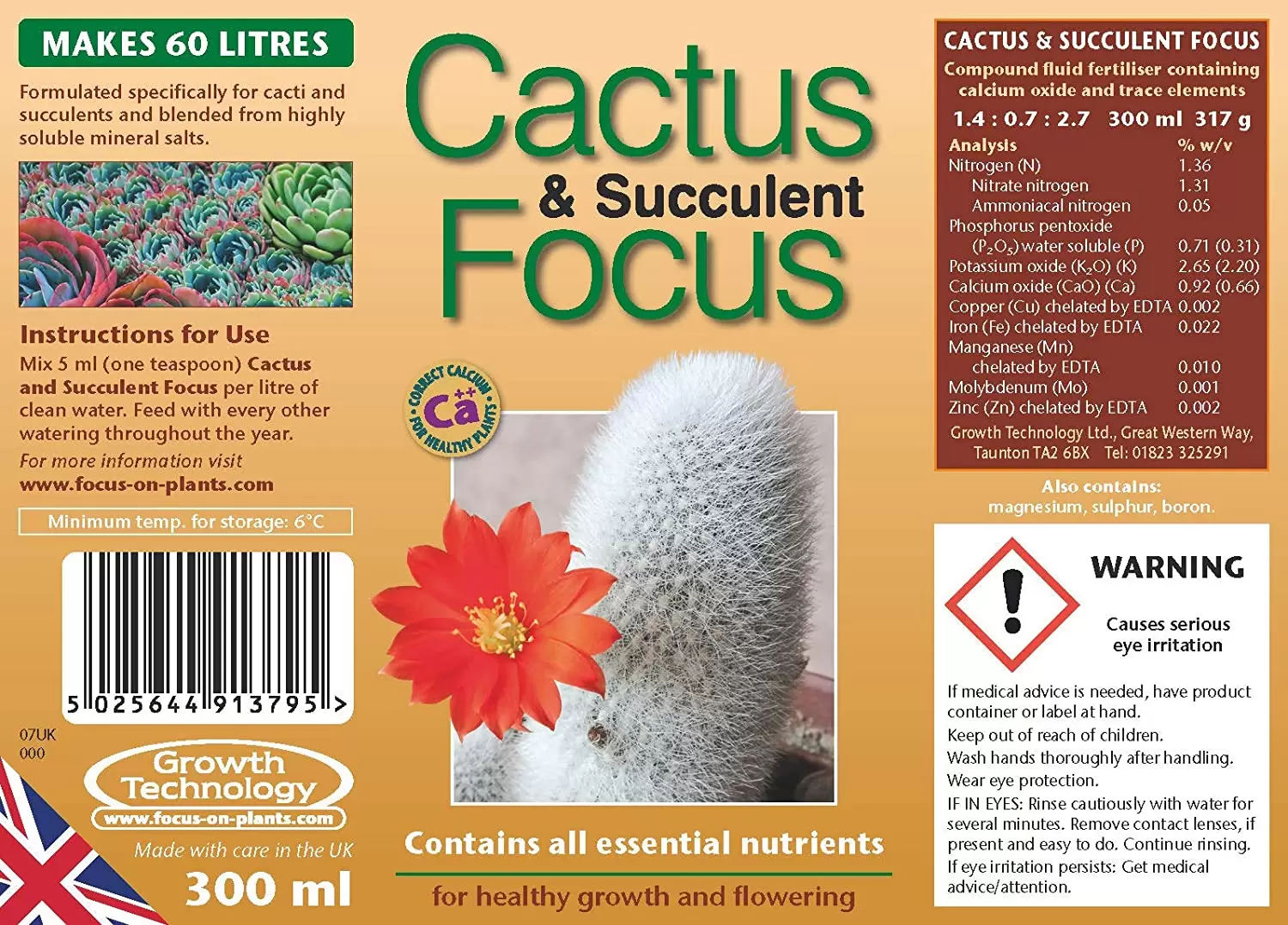 Growth Technology Cactus Focus has been specifically formulated for healthy growth and flowering of the widest range of cacti and succulents. Contains all necessary macro and micronutrients, as well as organic plant extracts such as humic and fulvic acids. Regular feeding will help to support healthy plant bodies, strong spination and vibrant flowering.