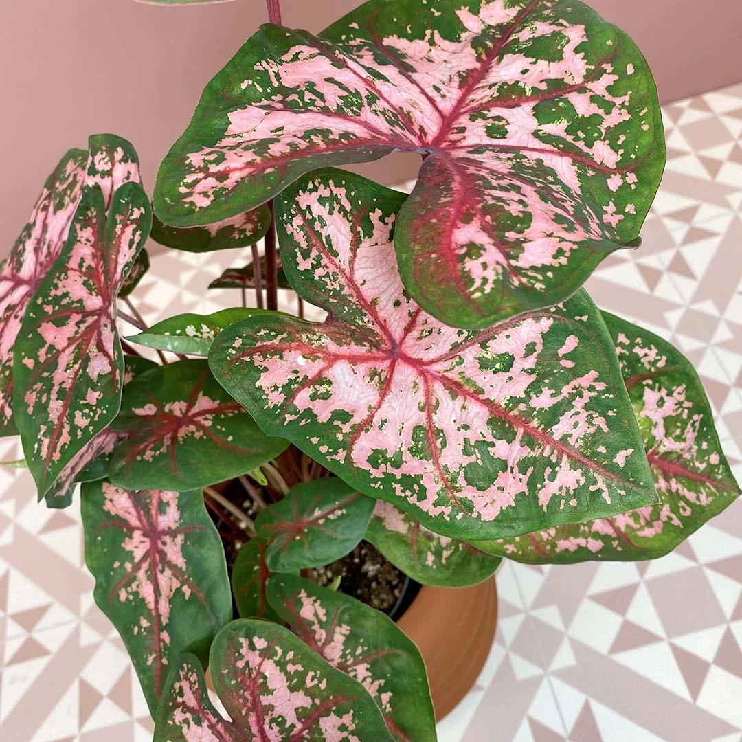 No horticulturist would begrudge you in thinking this plant was created in a work shop or art studio, not found growing naturally along the Amazon river basin. Caladium is a gorgeous member of the Araceae family, closely related to its well known cousins Anthurium, Philodendron and Alocasia. This incredible plant showcases vibrant mottled pink foliage, intense red veins and lush green leaf margins.