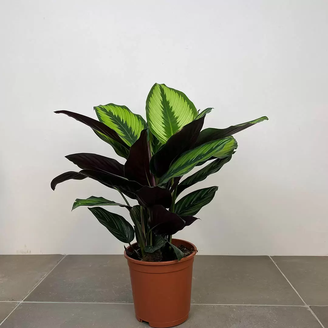 Calathea ornata 'Beauty Star' is a stunning cultivar that has refreshing, zingy foliage with multiple shades of green on the surface and deep purple underleaf. Calatheas are part of the prayer plant family (Marantaceae). They are great plants for areas where light is limited, making them very popular in basement flats, north-facing properties and inner-city homes. Calatheas are also somewhat particular, better suited for the more attentive plant owner. Beauty Star lives up to its name and is a beautiful plant that acts as an air purifier and is entirely child and pet safe.