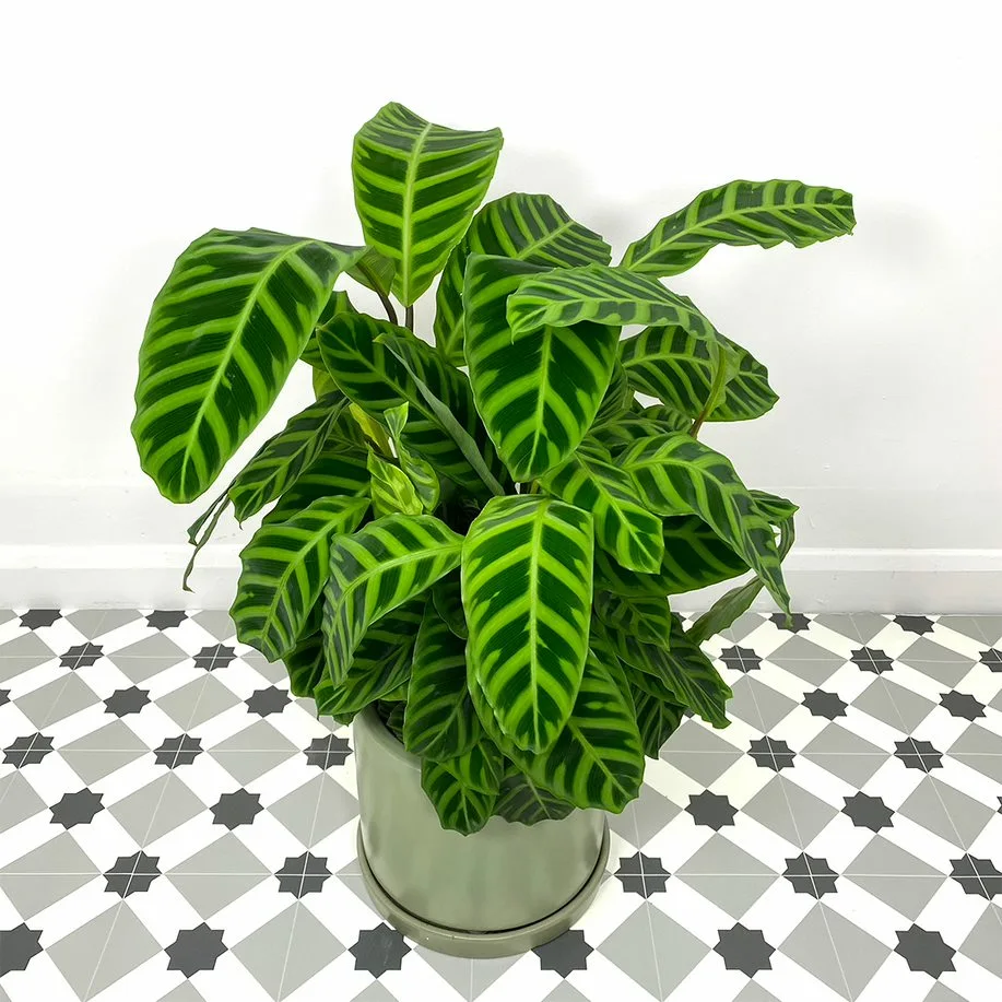 Calathea zebrina is a striking species with attractive all-green foliage and stand-out markings. Fresh green foliage with dark green stripes and large elongated leaves make this species of Calathea a real treat in the house. Calatheas are part of the prayer plant family (Marantaceae). They are great plants for areas where light is limited, making them very popular in basement flats, north-facing properties and inner-city homes. Calatheas are known to be somewhat particular, so they are better suited for the more attentive plant owner. As well as being absolute beauties, Calatheas are completely child and pet safe, and so are all-around fantastic houseplants.