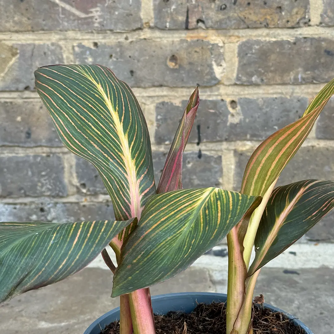 Canna 'Durban', commonly known as Durban Canna, is an eye-catching perennial known for its vibrant orange flowers and striking variegated foliage. The large, tropical leaves display a stunning mix of purple, green, and pink stripes, adding dramatic colour and texture to any garden setting. Blooming from summer through early autumn, 'Durban' is perfect for creating a bold statement in borders, beds, and large containers. With a tall and upright growth habit, this canna can reach heights of 150-180 cm, making it an excellent choice for adding height and interest to your garden. 'Durban' thrives in full sun and well-drained soil, requiring regular watering to maintain its lush appearance.