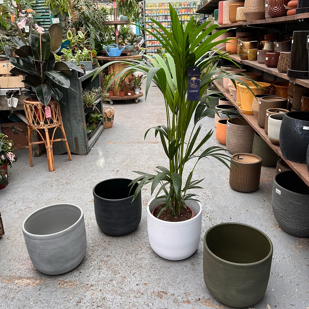 This decorative ceramic plant pot cover perfectly complements large specimen feature houseplants. It is ideal for large indoor plants such as Kentia Palm, Alocasia, Ficus, or Monstera.
