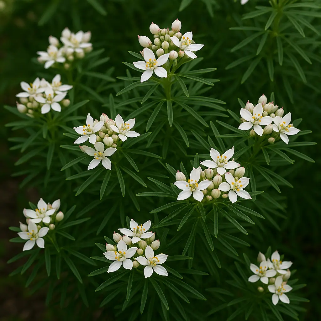 This variety forms a neat, rounded mound with slender, dark green leaves divided into finger-like leaflets. In late spring, it produces clusters of sweetly scented, star-shaped white flowers, often with a second flush in late summer or early autumn. The blooms are rich in nectar, attracting bees and butterflies, making it an excellent choice for pollinator-friendly gardens.