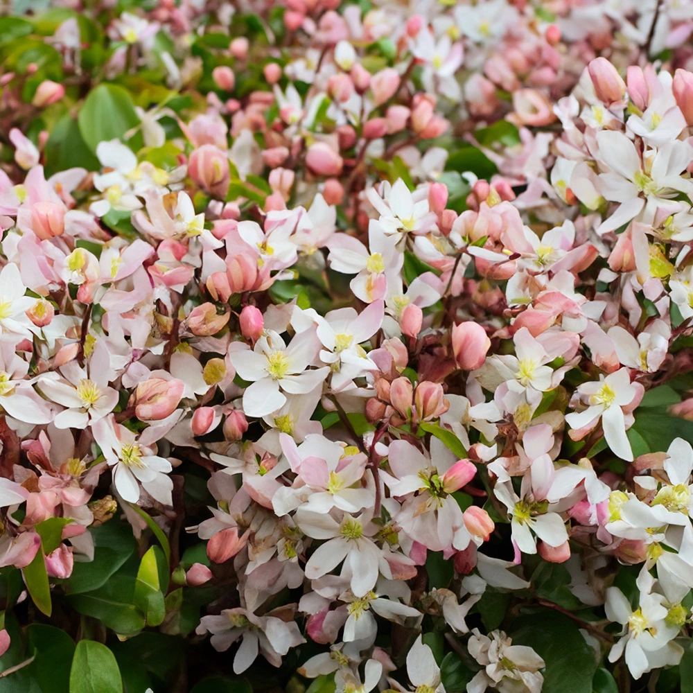 Clematis armandii ‘Apple Blossom’ is a fast-growing, evergreen climber, reaching heights of 6-9 meters with a spread of 1.5-2.5 meters. Its leathery, dark green leaves emerge with a bronze tint, offering year-round interest. The flowers, which open from deep pink buds, are tinged white and cover the vine in clusters, providing a striking and fragrant display in spring. This clematis thrives in full sun to partial shade, and prefers a sheltered position to protect it from cold winds. It is particularly suited to south-facing or west-facing aspects