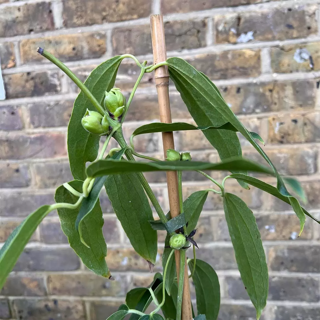 Plant Clematis ‘Apple Blossom’ in moist but well-drained soil with a neutral to alkaline pH. Shelter it from cold winds and provide support with a trellis or arbor for best growth. Prune after flowering to control size and encourage new blooms. Regular watering is necessary, especially in the first year