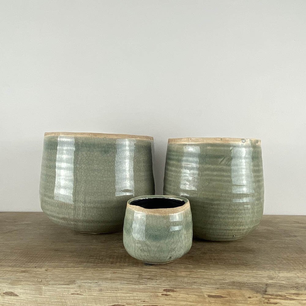 Handcrafted in the UK, this small Como indoor plant pot cover has a Mint aged crazed glaze finish, ideal for the home or office. Available in several sizes and colours Ivory, Mint, Turquoise.