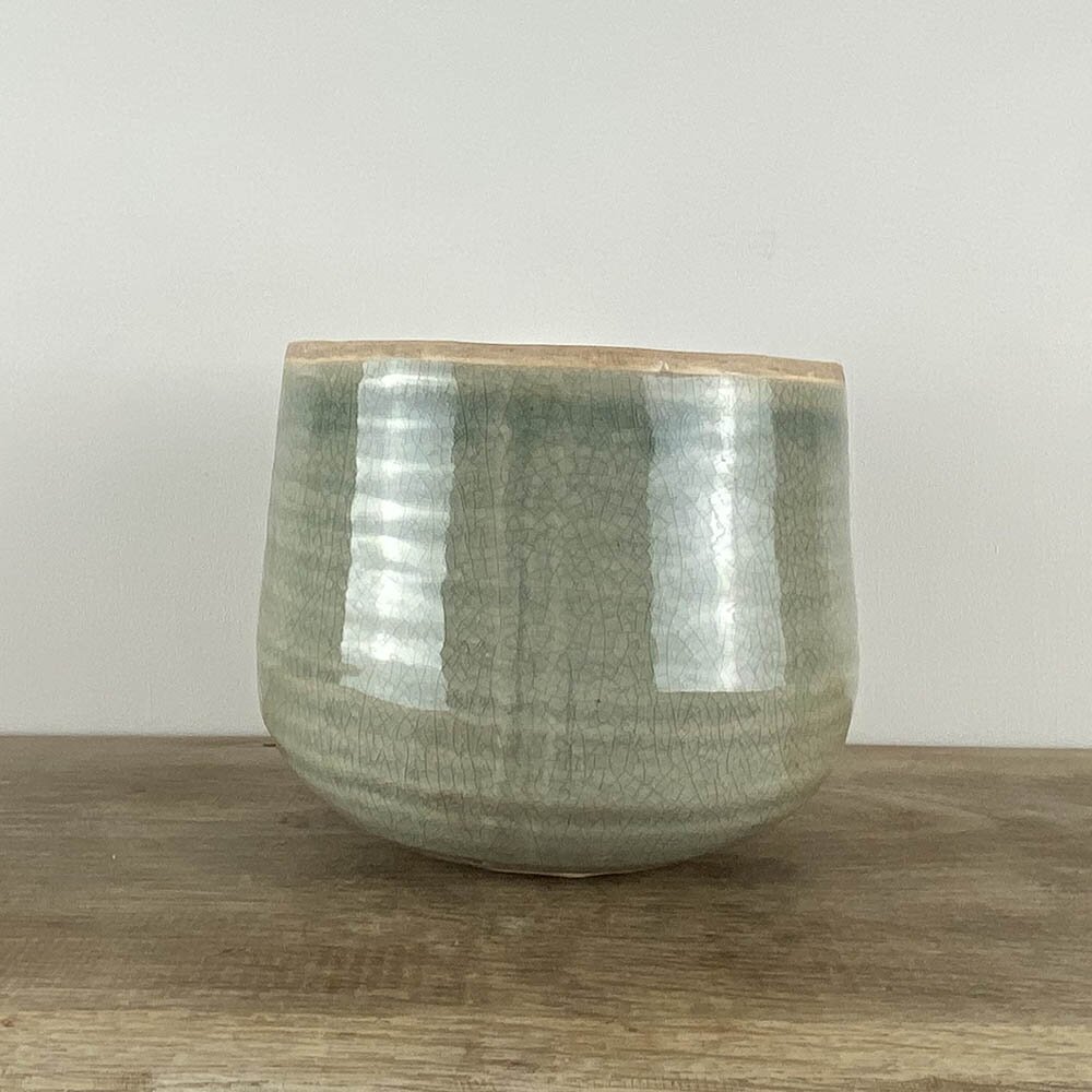 Handcrafted in the UK, this small Como indoor plant pot cover has a Mint aged crazed glaze finish, ideal for the home or office. Available in several sizes and colours Ivory, Mint, Turquoise.