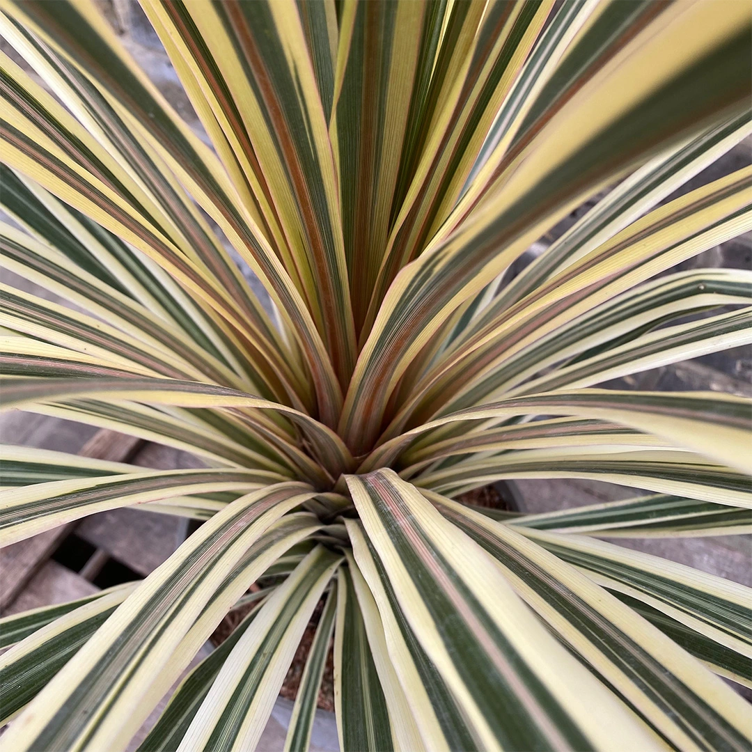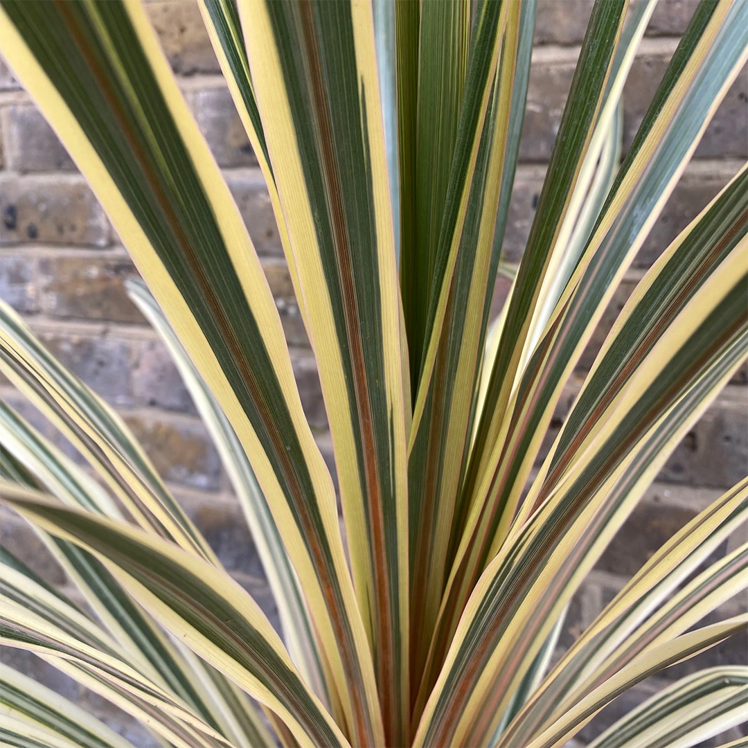Cordyline australis 'Torbay Dazzler' is a stunning evergreen shrub known for its architectural form and vibrant foliage. This variety stands out with its long, sword-like leaves that boast a beautiful variegation of green and cream stripes, adding a touch of exotic flair to any garden setting. 'Torbay Dazzler' can grow to a height of up to 4 metres, making it an impressive focal point whether planted in the ground or in a large pot. It's particularly well-suited to modern, tropical, and coastal garden designs, offering year-round interest with its striking foliage. This Cordyline is not only visually appealing but also hardy and low maintenance, able to withstand coastal conditions and requiring minimal care once established. It prefers a sunny to partially shaded position in well-drained soil, making it a versatile choice for gardeners looking to create an exotic vibe in their outdoor spaces.