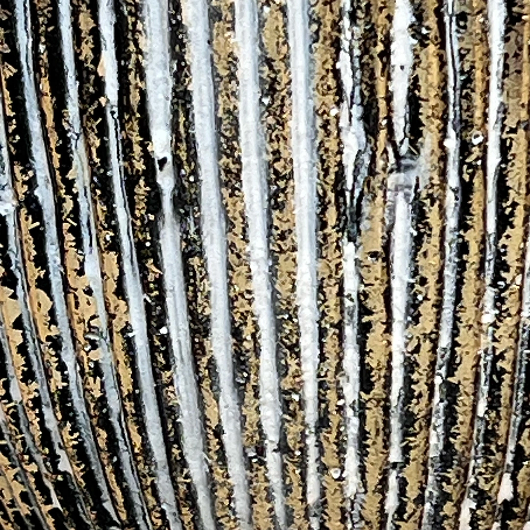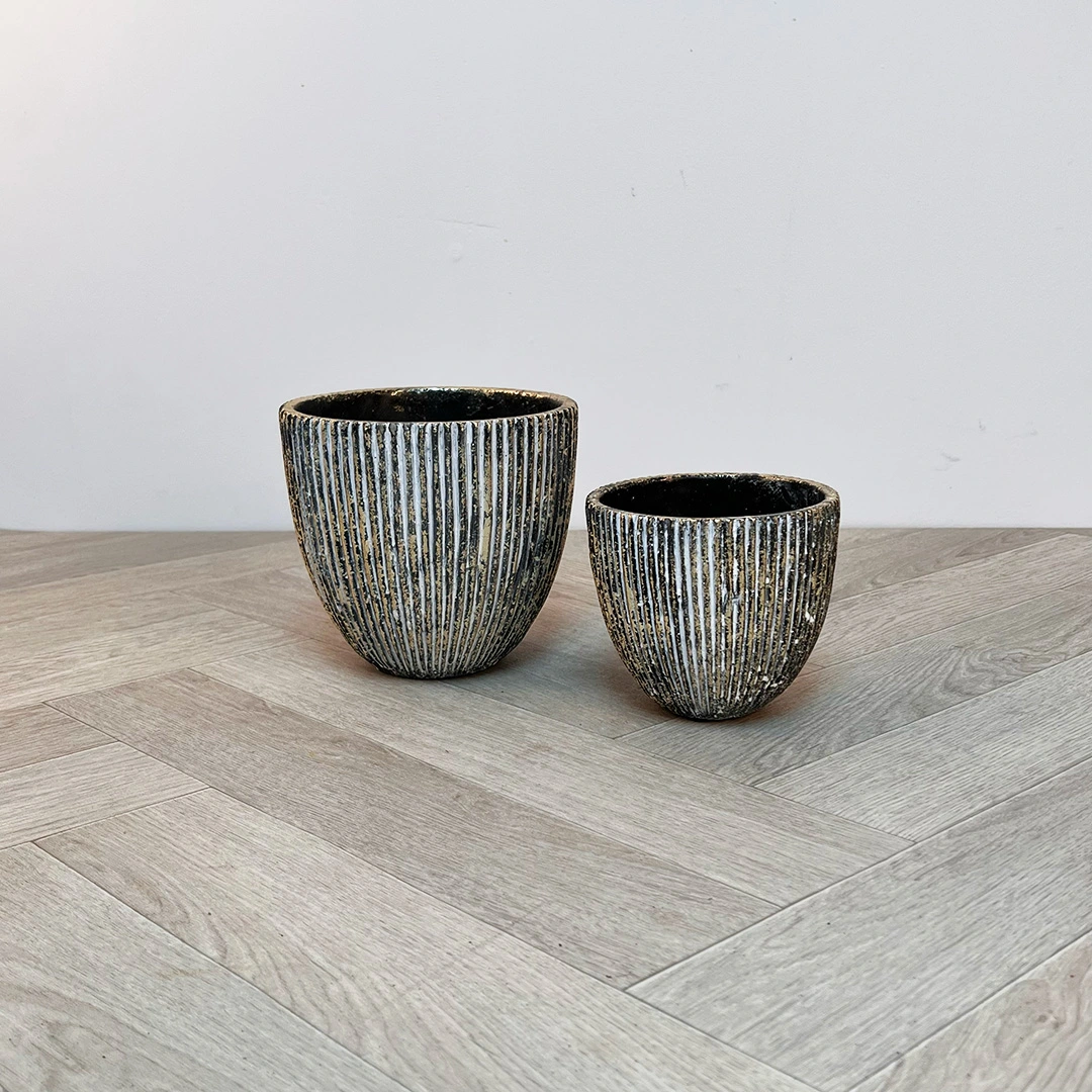 This pot showcases a gold ribbed relief interspersed with white grooves, a design that adds depth and character to its smooth egg-like shape. The combination of golden hues and white accents radiates an inviting warmth, creating a piece that demands attention yet blends seamlessly into your interiors.