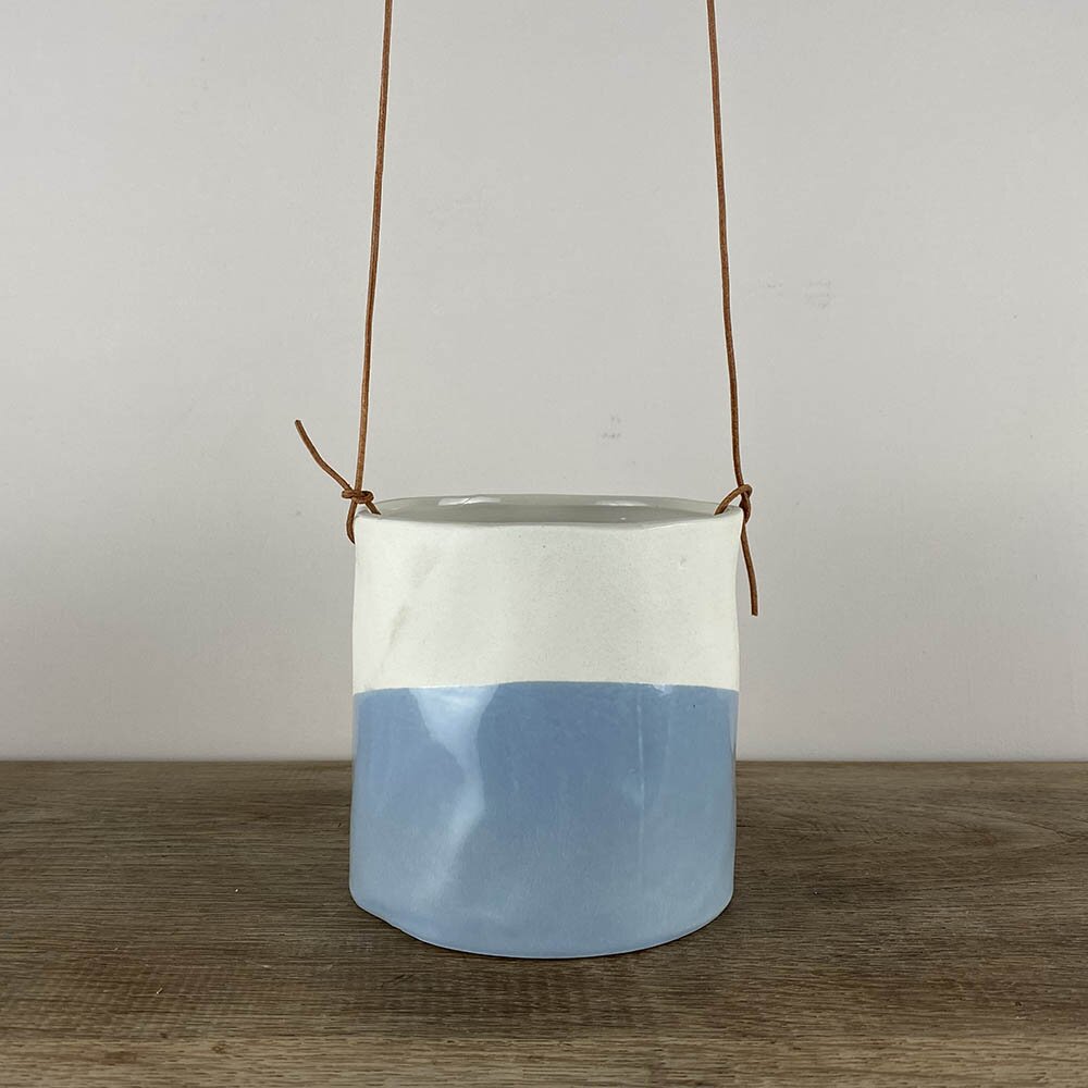 A matt white indoor houseplant hanging pot with a brown leather cord dipped in a sky blue glaze. The hanging pot is highly durable and lightweight without a drainage hole, making it ideal for the home or office.