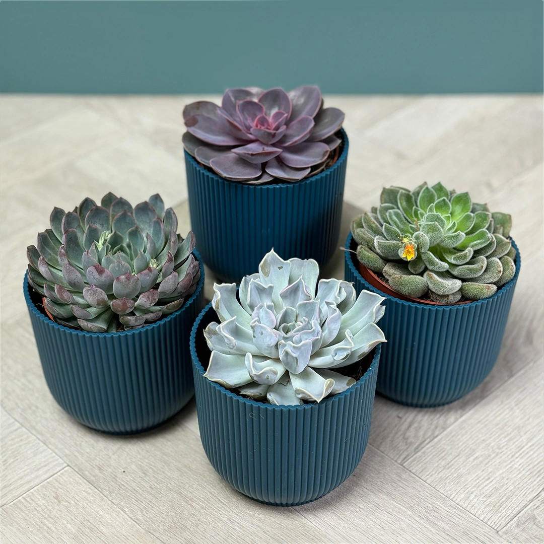 The Echeveria 4 Succulent Collection, now presented with four elegant 14cm Blue Elho Pots, offers a perfect blend of sophistication and ease for plant enthusiasts. The collection includes the 'Purple Pearl', with its lustrous purple leaves, and the 'Thriller Pearl', which captivates with lilac tones and a classic rosette form. The 'Pelisuda' stands out with its soft, fuzzy foliage, while the 'Setosa' boasts dense, hairy rosettes for a stunning textural contrast. These succulents, previously in 12cm sizes, have been upgraded to suit the chic Blue Elho Pots, providing a modern and clean look that complements any interior or garden design. Ideal for both novice and expert gardeners, this collection is designed for minimal upkeep while ensuring your space is graced with their enduring beauty. The pots not only add to the visual appeal but also ensure the perfect environment for these drought-tolerant plants to thrive, making the Echeveria 4 Succulent Collection a statement of elegance and simplicity.