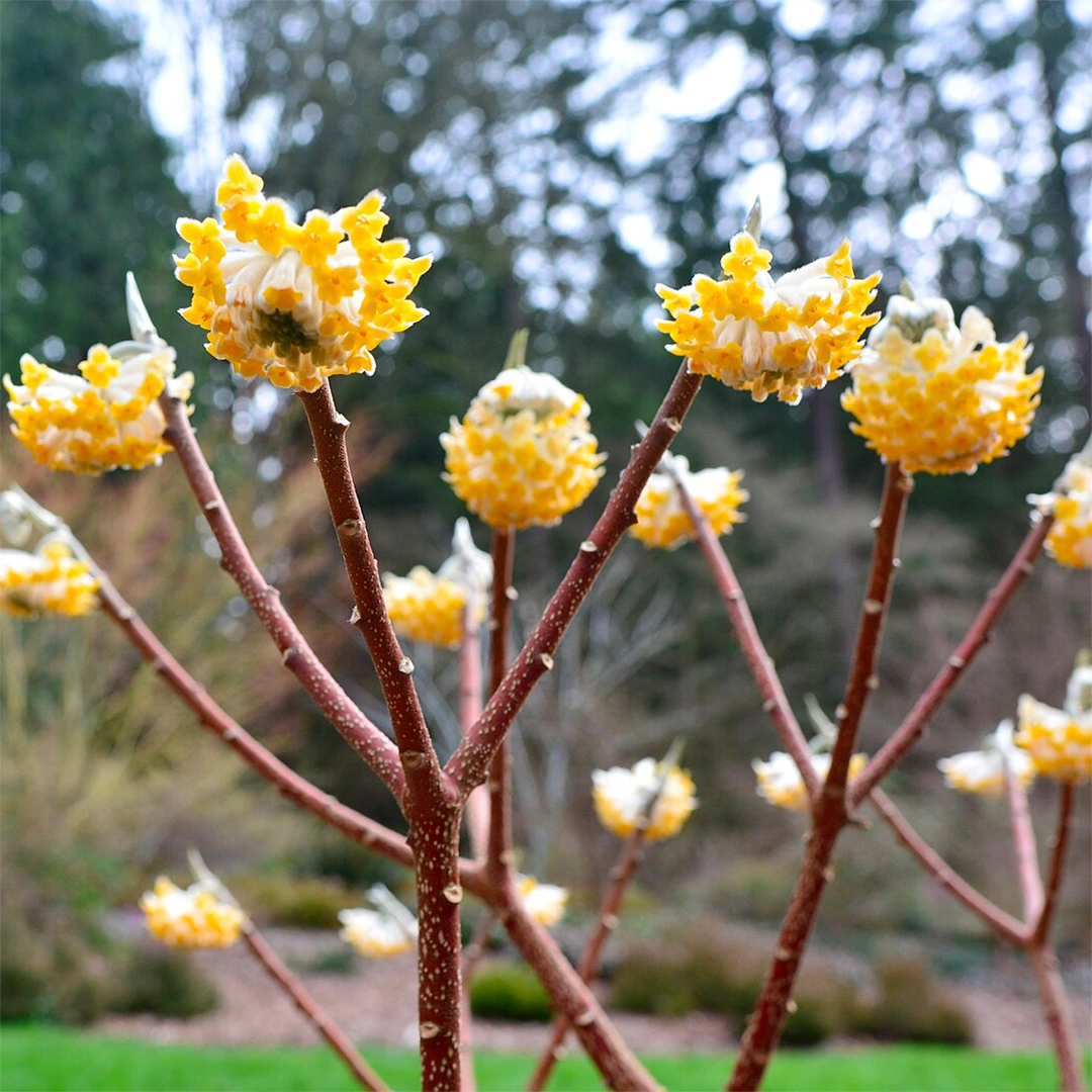 Edgeworthia grandiflora, commonly known as Paper Bush, is a highly ornamental deciduous shrub that offers year-round interest, culminating in a spectacular display of fragrant, yellow flowers in late winter to early spring. Supplied in a 5-litre pot, this shrub is renowned for its rounded, bushy habit and the striking appearance of its silvery flower buds throughout autumn, which blossom into dense clusters of golden flowers. The blooms not only add a splash of colour to the winter garden but also emit a delightful fragrance, attracting pollinators during the cooler months. Paper Bush prefers a sheltered position in partial shade, making it an ideal choice for woodland gardens, mixed borders, or as a focal point in a winter garden. Its unique characteristics and the structural interest of its stems make it a valuable addition to any garden, providing beauty and fragrance when most other plants are dormant.