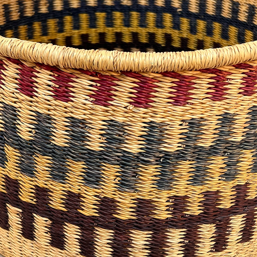This basket's standout feature is its decorative patterns in red, blue, and brown hues. These vibrant designs add a pop of colour and a touch of exotic appeal to any space. Every stroke and pattern tells a story, bringing a piece of African heritage into your home.