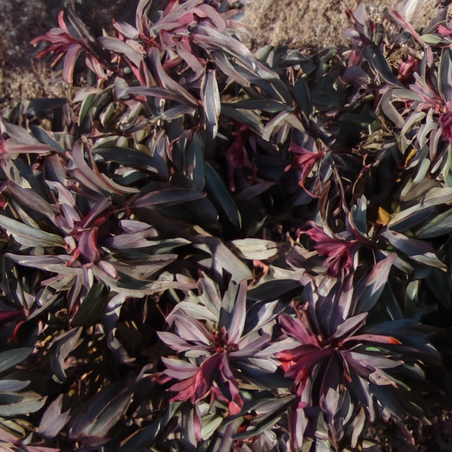 Euphorbia 'Purpurea' requires minimal care once established, preferring well-drained soil and a sunny to partially shaded position to flourish. Watering should be moderate, allowing the soil to dry out between watering sessions, which suits its drought-tolerant nature. Pruning is seldom necessary but removing spent flower stems after blooming can help maintain a tidy appearance. As with all Euphorbias, caution should be exercised when handling, as the sap can be an irritant.