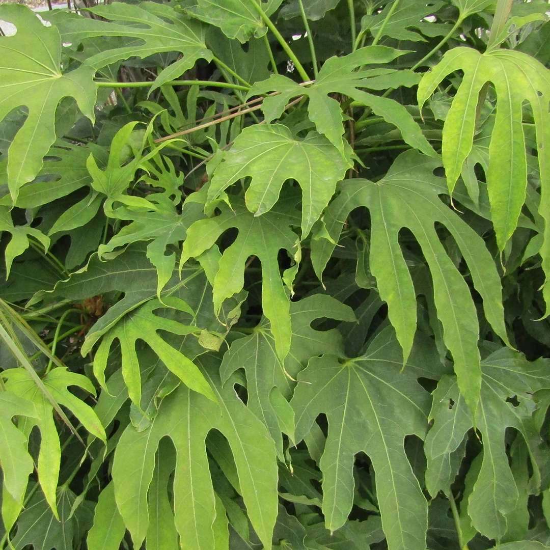 Fatsia polycarpa is a shade-loving species of Fatsia native to Taiwan. It has palmate divided foliage that provides year-round interest and a touch of the exotic to planted borders and containers. A perfect plant for adding life and interest to a shady corner of the garden. Small clusters of tiny white flowers on established plants are followed by black berries in the autumn. Ideal for planting in a large container for that urban jungle feel.