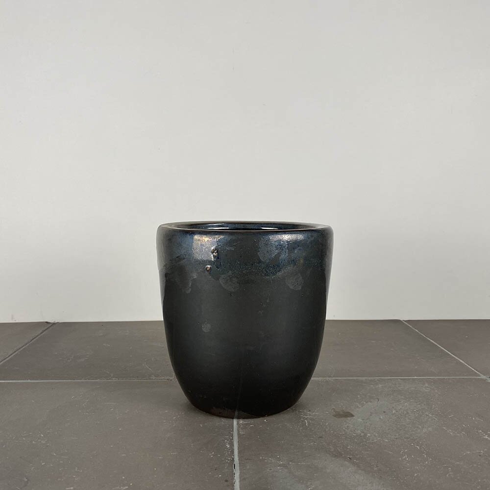 High quality hand glazed pot in muted tones of metallic Bronze and Silver. Contoured conical shape with an inner lipped edge at the top. A subtle modern simple design. The pot cover has no drainage hole.