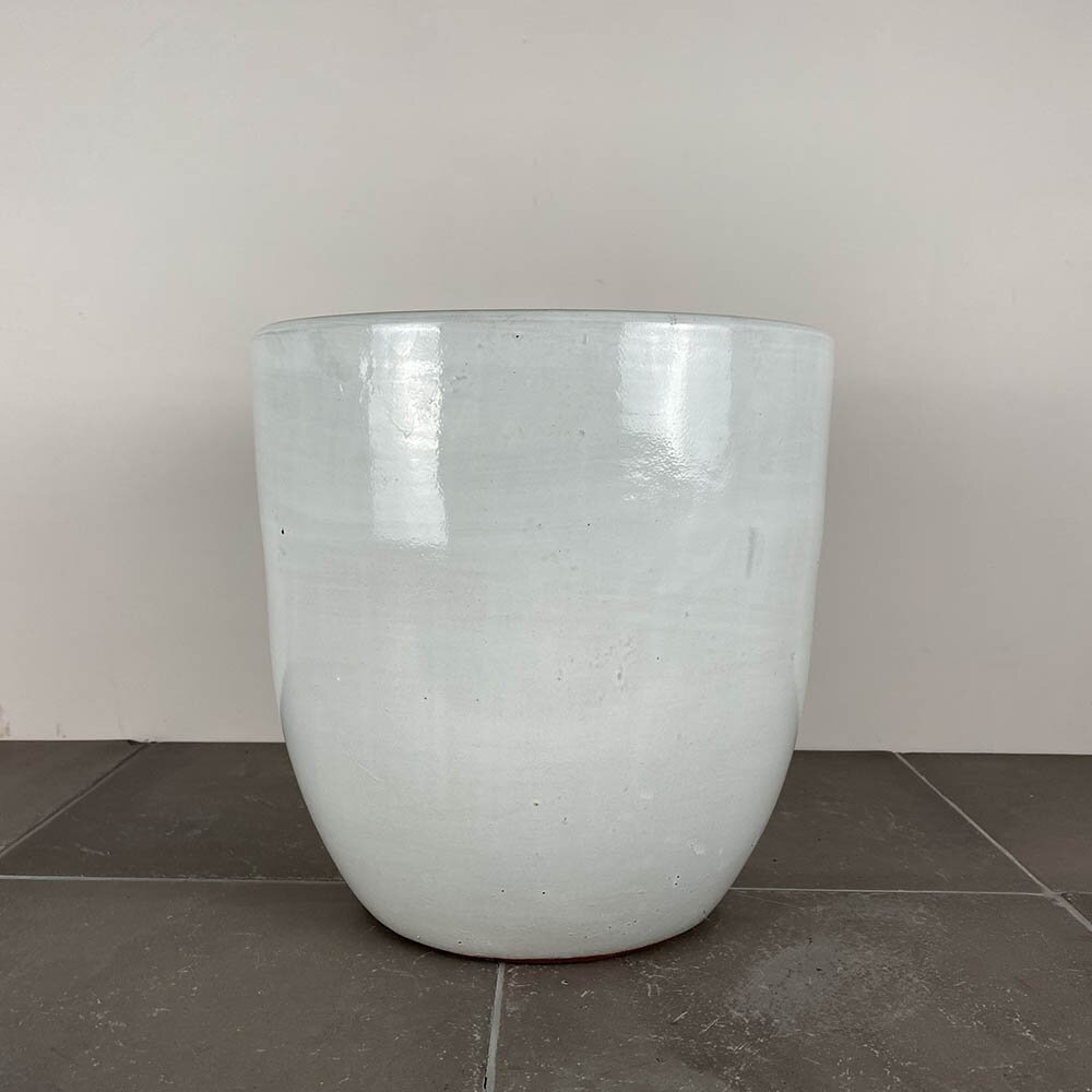 High quality hand white glazed terracotta indoor plant pot. Contoured conical shape with an inner lipped edge at the top. A subtle modern simple design. The pot cover has no drainage hole.