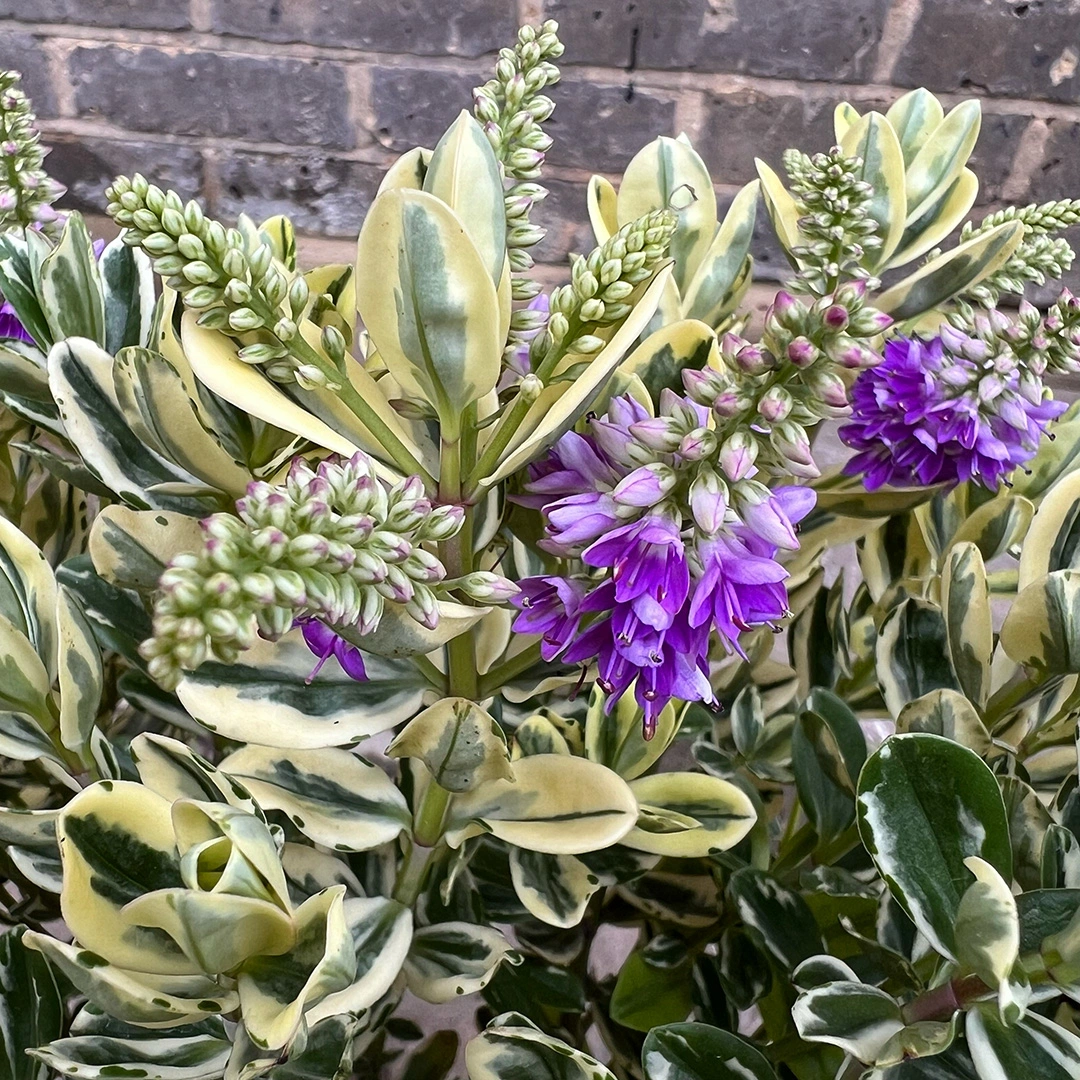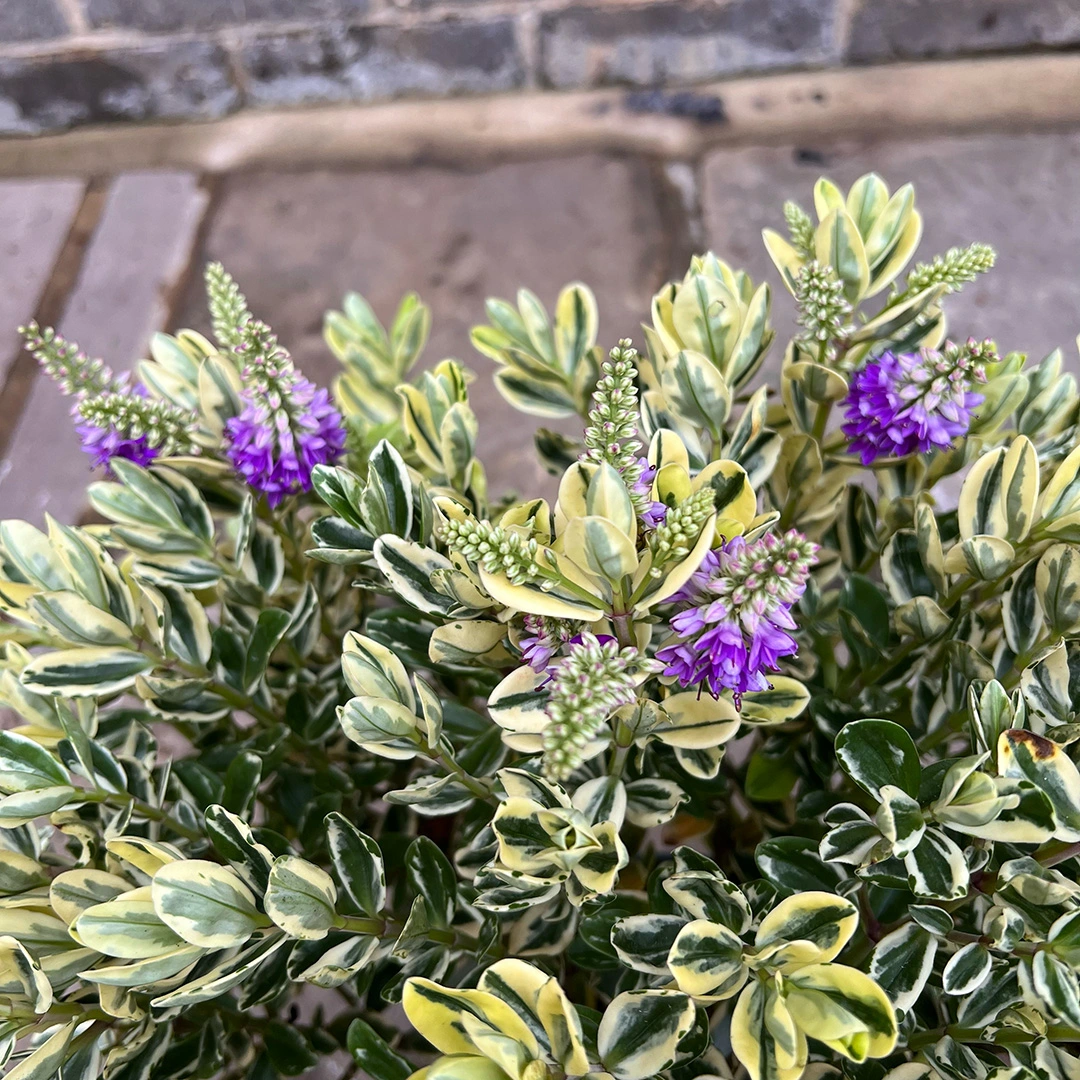 The Variegated Hebe, scientifically known as Hebe 'Variegata', showcases an impressive display of vibrant purple flowers during the summer. Its standout feature is its bright variegated foliage, presenting a mix of green and creamy-white hues. Standing compact and bushy, this shrub serves as an excellent choice for borders, containers, and small garden spaces. Additionally, it works brilliantly when paired with plants like Lavenders, Rosemary, and other Mediterranean-style plants, bringing a harmonious blend of colours and textures to any garden setting.