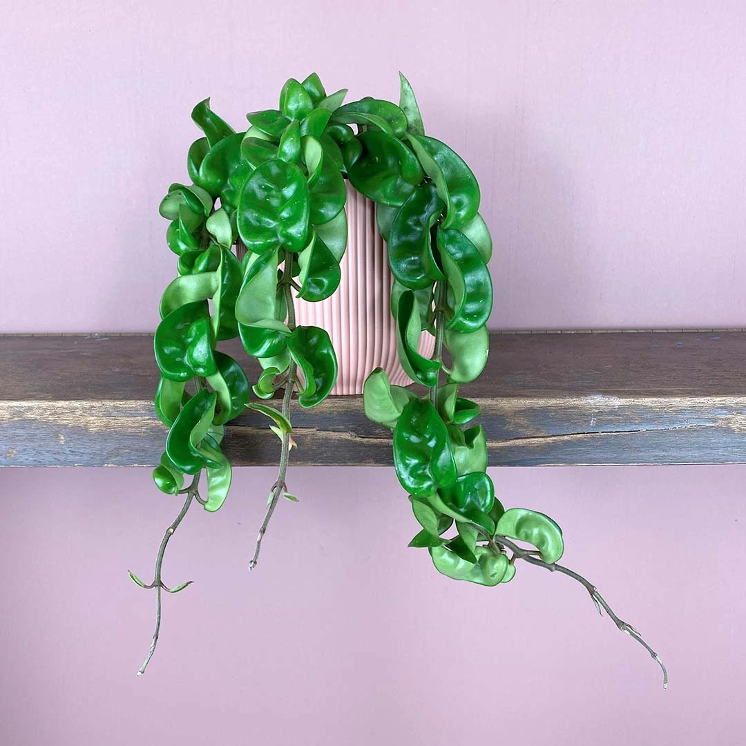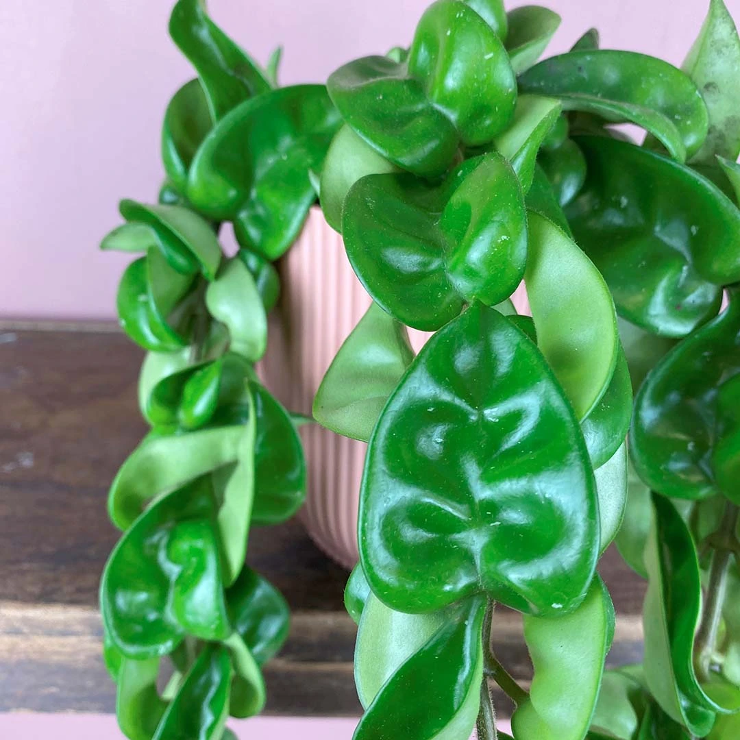 Hoya carnosa 'Compacta' is a strange yet beautiful variety of Hoya due to its puckered, rigid foliage and clusters of pale pink flowers. They require high light levels for optimum growth and feed to encourage flowering. They can withstand cooler temperatures, perfect for bright hallways or offices- ensure you don't overwater as that is a surefire way to kill your waxvine. Allow soil to dry out between waterings and spray the foliage with houseplant mist feed for a healthy, flowering Hoya.