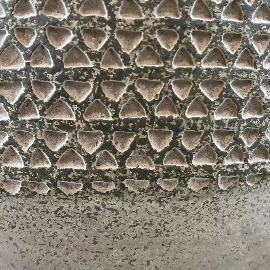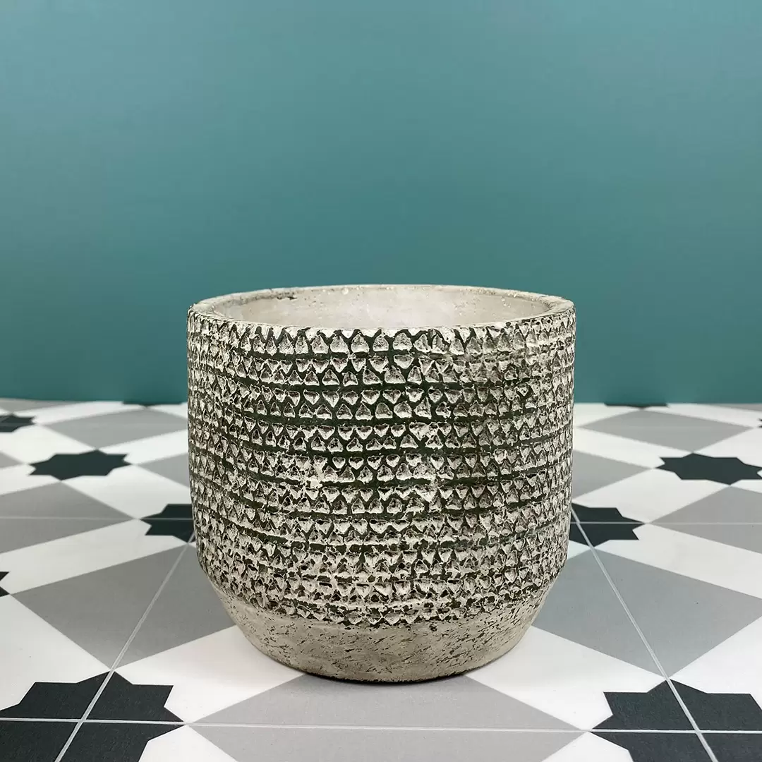 Striking monochrome design with a series of tiny triangles imprinted into the pot finished in a khaki green wash