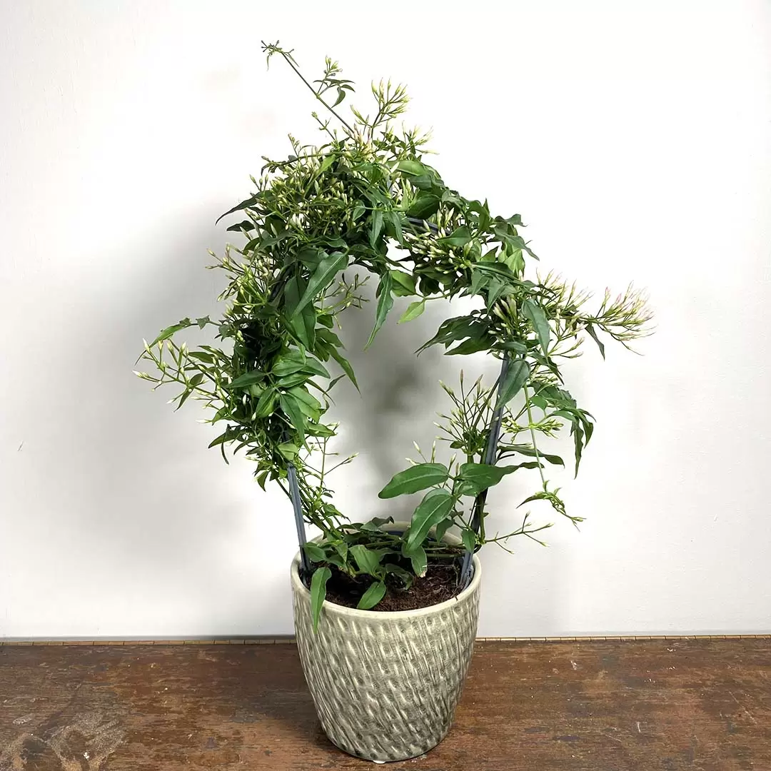 Jasminum polyanthum is a fantastic flowering plant for cooler house spots and thrives outdoors as long you protect it from frost. Just as long as there is enough light and kept moist, your jasmine plant can survive anywhere really- it will hold its blooms longer in a cooler environment. With its heavy flowering nature and gorgeous heady flowers, the sweet smell of Jasminum polyanthum is almost intoxicating. This flowering jasmine is trained around a hoop full of bud. This decorative plant and makes a perfect gift or centrepiece plant.