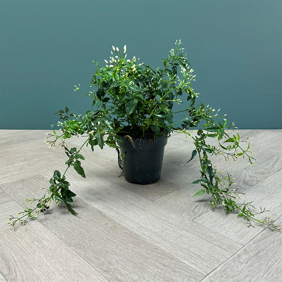 Jasminum polyanthum is a fantastic flowering plant for cooler house spots and thrives outdoors as long you protect it from frost. Just as long as there is enough light and kept moist, your jasmine plant can survive anywhere really- it will hold its blooms longer in a cooler environment. With its heavy flowering nature and gorgeous heady flowers, the sweet smell of Jasminum polyanthum is almost intoxicating. Flowering Jasmine is trained around a hoop full of bud and a decorative plant and makes a perfect gift or centrepiece plant.