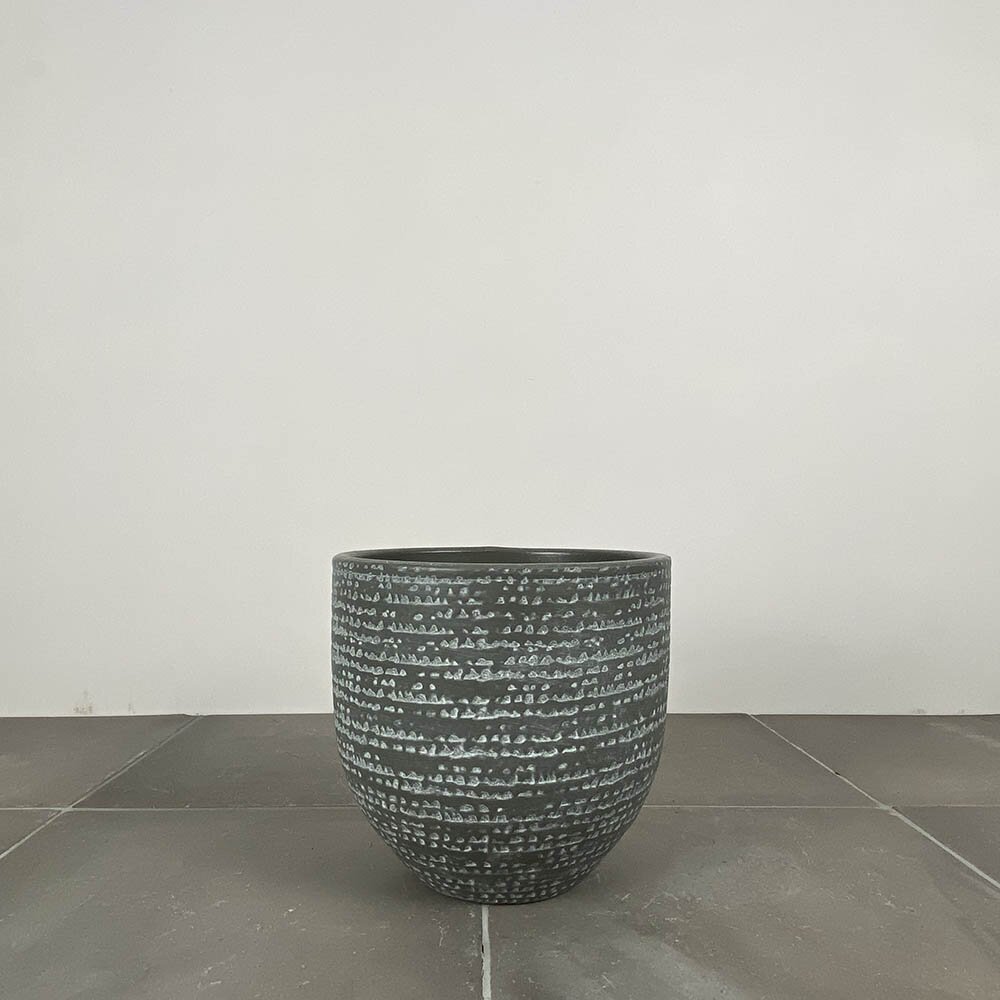 Versatile range of pot covers with a natural concrete dark grey rugged finish. Mottled tones of light and dark grey. Available in 7 different sizes. The muted tones and modern design offer a beautiful compliment for plants and interior design.