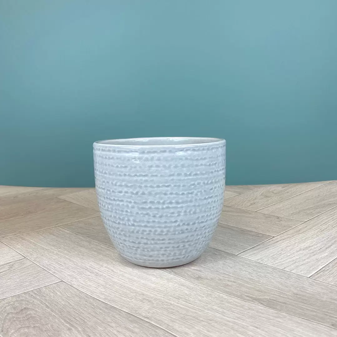 Versatile range of pot covers with a glazed soft light grey and denim blue rugged finish. Mottled tones of soft light grey and denim blue. The muted tones and modern design offer a beautiful compliment for plants and interior design.
