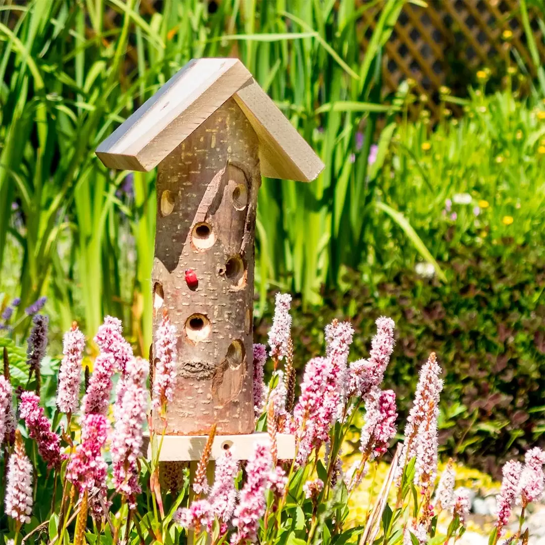 The ladybird tower comes with a ground pole (fixed at the rear for transport). It allows the ladybird tower to be sited into lawns, sheltered flower beds, wooded glades, or even planters.