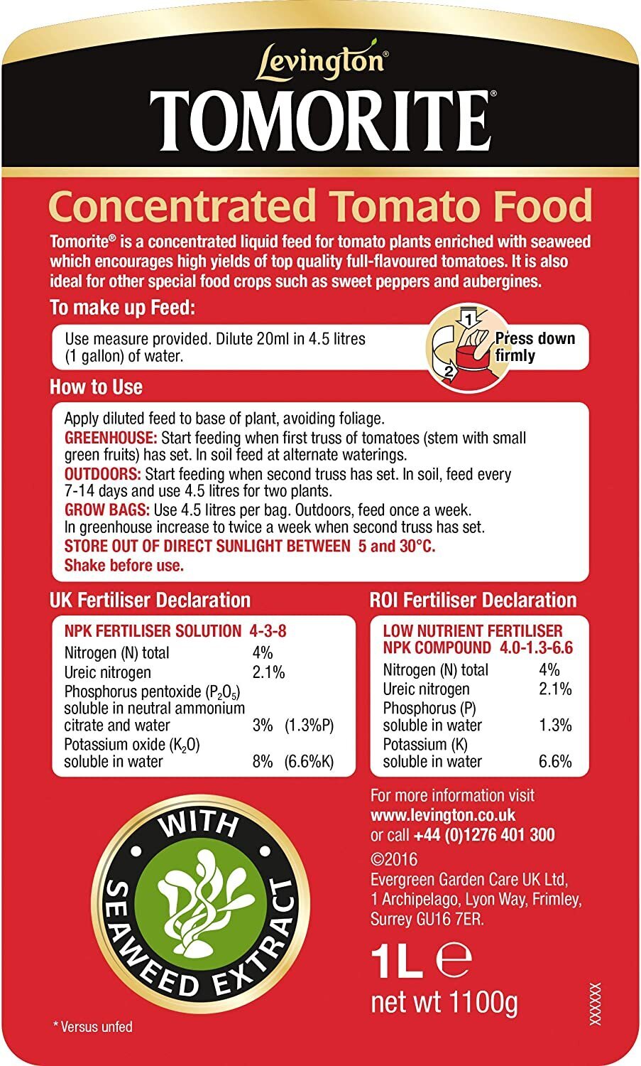 Levington Tomorite Concentrated Tomato Food is the country’s favourite liquid plant food for tomatoes enriched with seaweed extract. It is ideal for tomatoes, vegetables and flowering pot plants and produces top-quality, full-flavoured tomatoes. Easy to apply simply mix with water in a watering can according to instructions