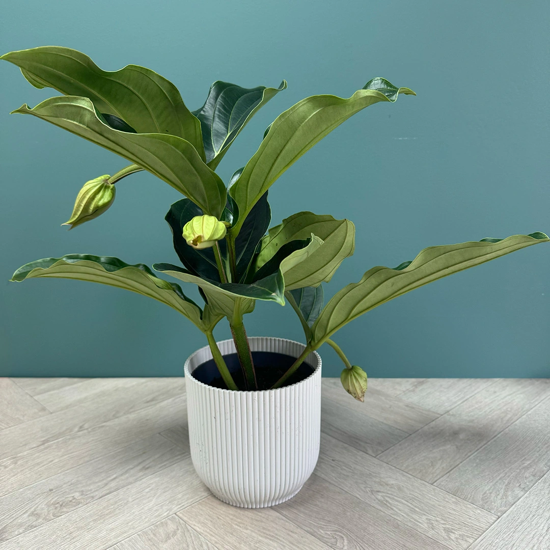 Medinilla is an incredible genus of plants. With their striking pendulous flowers and overall exotic appearance, it is a treat to have M.magnifica as a houseplant here in the UK. Native to the Philippine Islands, they require sufficient humidity and warm temperatures to flourish truly. This Medinilla prefers a bright spot (not direct sunlight) that allows room for its large blooms to unfurl fully, making it the perfect hanging plant. The flowers of the rose grape will eventually go over and start to turn brown. When this happens, snip them off at the base of the flower stalk (where it's attached to the leaf) to encourage reflowering.