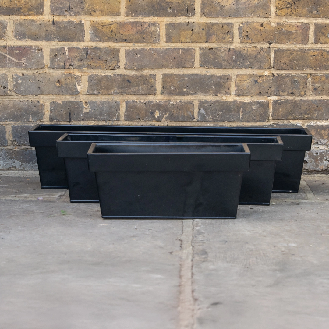 - Black metal window box trough planter.