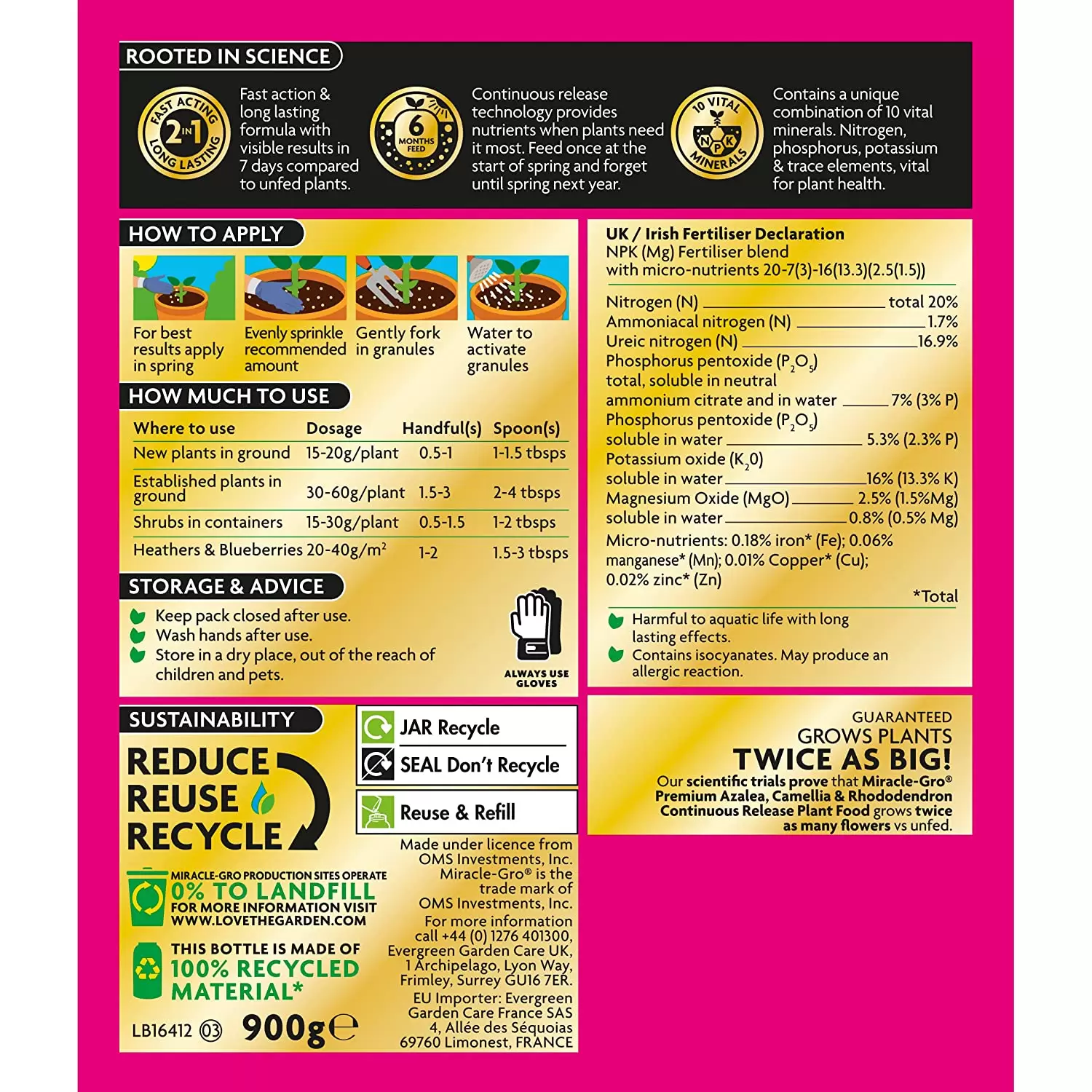 Miracle-Gro Azalea, Camellia & Rhododendron Continuous Release Plant Food is for ericaceous, acid-loving plants. It includes a temperature-controlled coating that regulates the release of nutrients when the conditions are right for feeding. One application feeds plants for up to 6 months, removing the need for regular feeding.