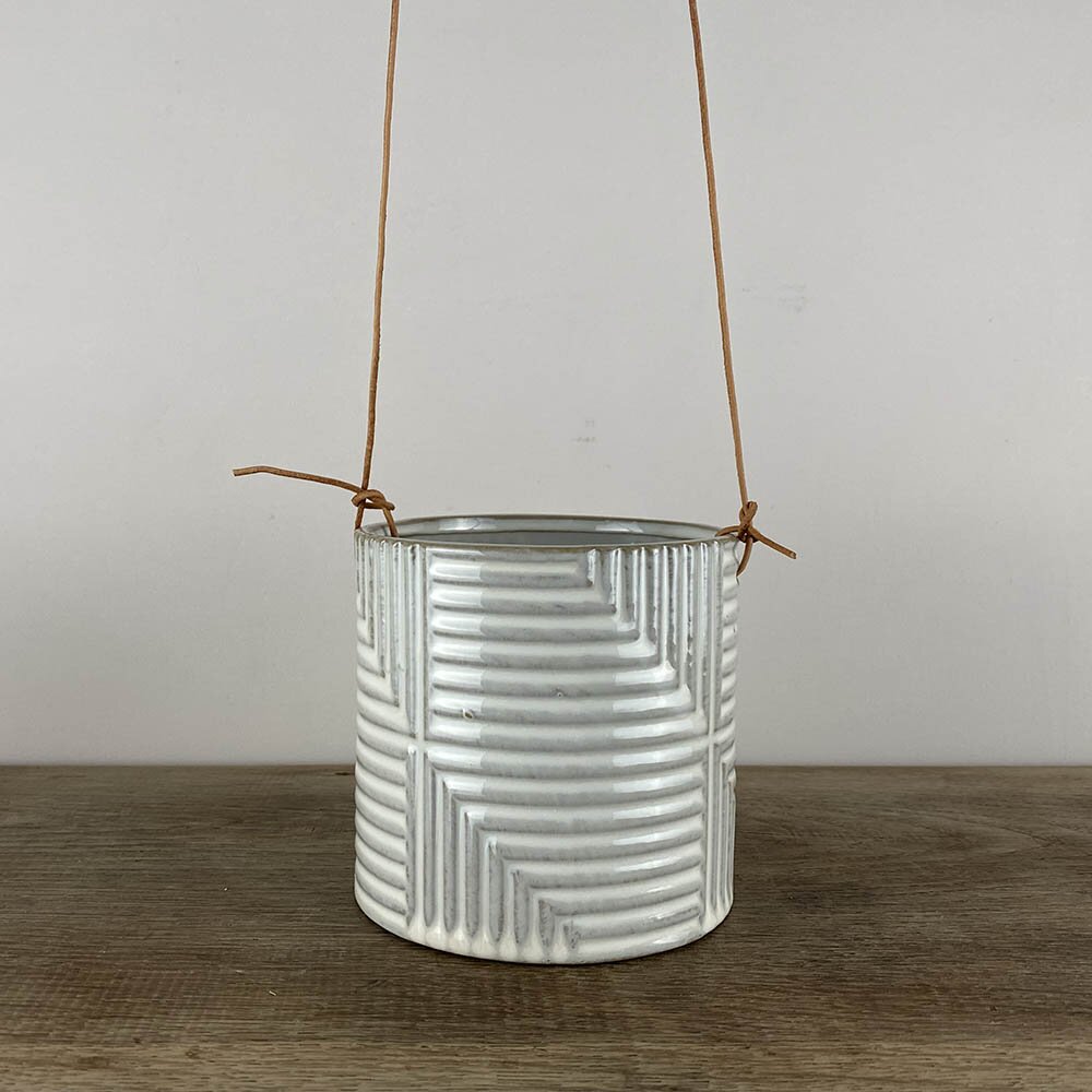A contemporary lightweight hanging plant pot with leather rope hanger. This handmade pot has a ridged fluted geometric design and a white glaze.