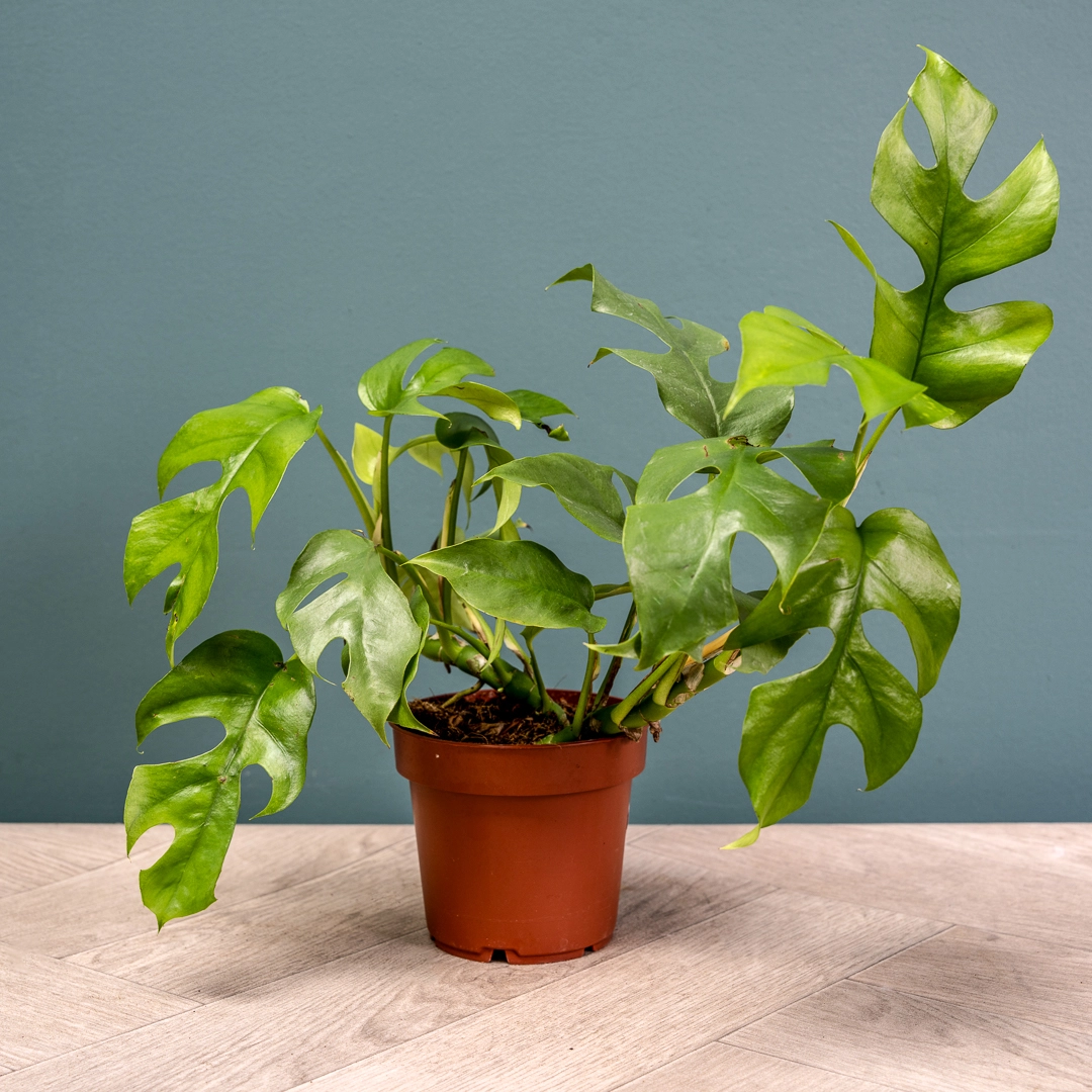 Monstera Minima thrives in bright, indirect light but can tolerate lower light conditions. Water when the top inch of soil is dry, ensuring good drainage to prevent waterlogging. It enjoys moderate humidity, but it adapts well to average indoor conditions. Fertilize monthly during the growing season with a balanced liquid fertilizer. Keep it away from cold drafts and direct sunlight, which can scorch its leaves. Dust the leaves regularly to keep them looking vibrant. A small Elho pot cover or a ceramic planter will enhance its compact and stylish appearance.