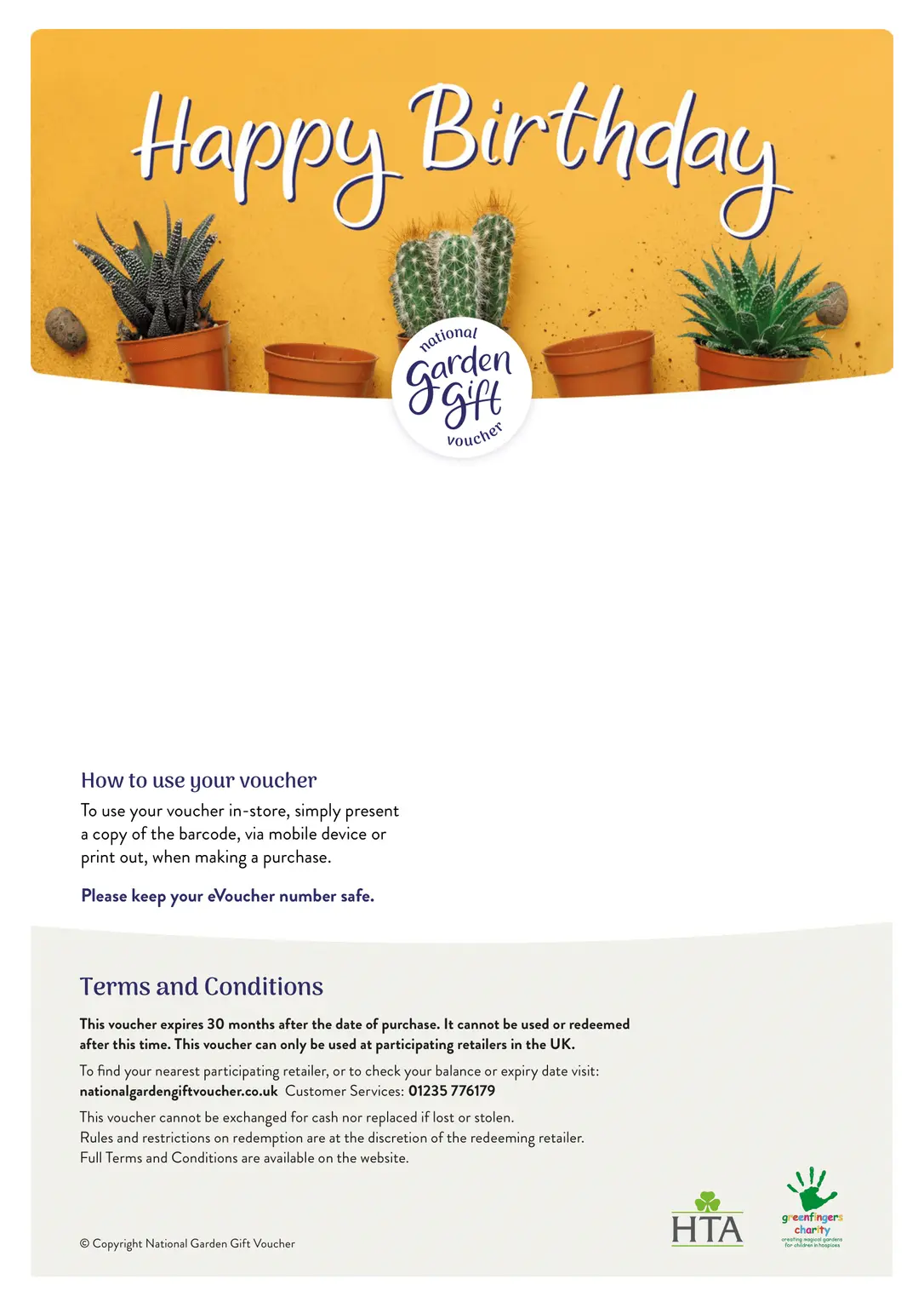 Buy National Garden Gift Voucher - Happy Birthday! at The Boma Garden Centre in Kentish Town, London. Visit our garden centre in London and check our wide range of plants & gardening products. We also offer many other products in our webshop. We look forward to seeing you soon!