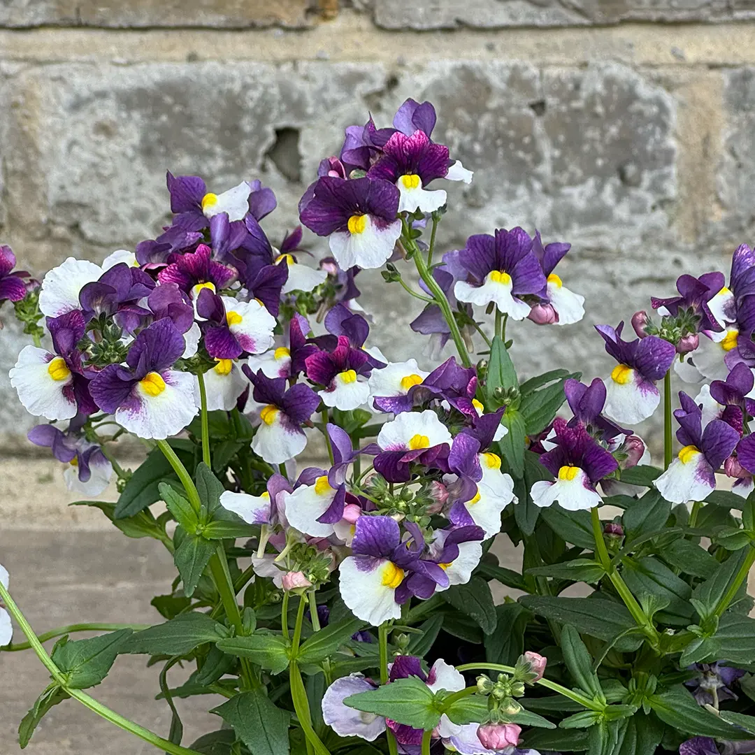 Nemesia 'Sunpeddle Plum' is a vibrant bedding plant that brings a burst of colour to your garden with its rich plum-coloured flowers. This Nemesia blooms profusely from spring through autumn, providing a long-lasting display of stunning colour. The compact and bushy growth habit makes it perfect for containers, hanging baskets, and garden borders. 'Sunpeddle Plum' is an easy-to-grow plant that thrives in full sun to partial shade, adding a cheerful touch to any garden space. It pairs beautifully with other bedding plants such as petunias and lobelias, creating a harmonious and colourful garden display.